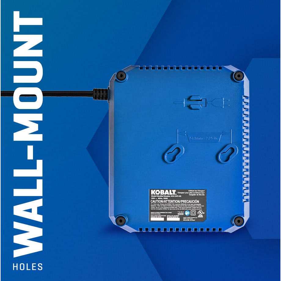 The new 150W fast charger for Kobalt 24v batteries incorporates the latest technology in electronic charger designs, resulting in the fastest charge times for Kobalt 24v batteries. The advanced electronics is much more efficient than standard battery chargers resulting in faster charging and reduced energy losses which eliminates the need of a noisy cooling fan like other fast chargers. Enjoy the noise-free environment while you work. Recharge a 2.0Ah battery in just 30 minutes, getting you back to work quickly! The charger features an easy-to-read charge indicator to inform the user of the charging status. The new design allows for charger to rest on a flat surface such as a workbench or mount to the wall using keyholes on the back of the charger. The keyholes are vertically aligned for added convenience so both screws can be on a wall stud, eliminating the need for wall anchors. The back of the charger has a cord clip which allows the cord to wrap around the charger and clip in place when traveling with the charger.