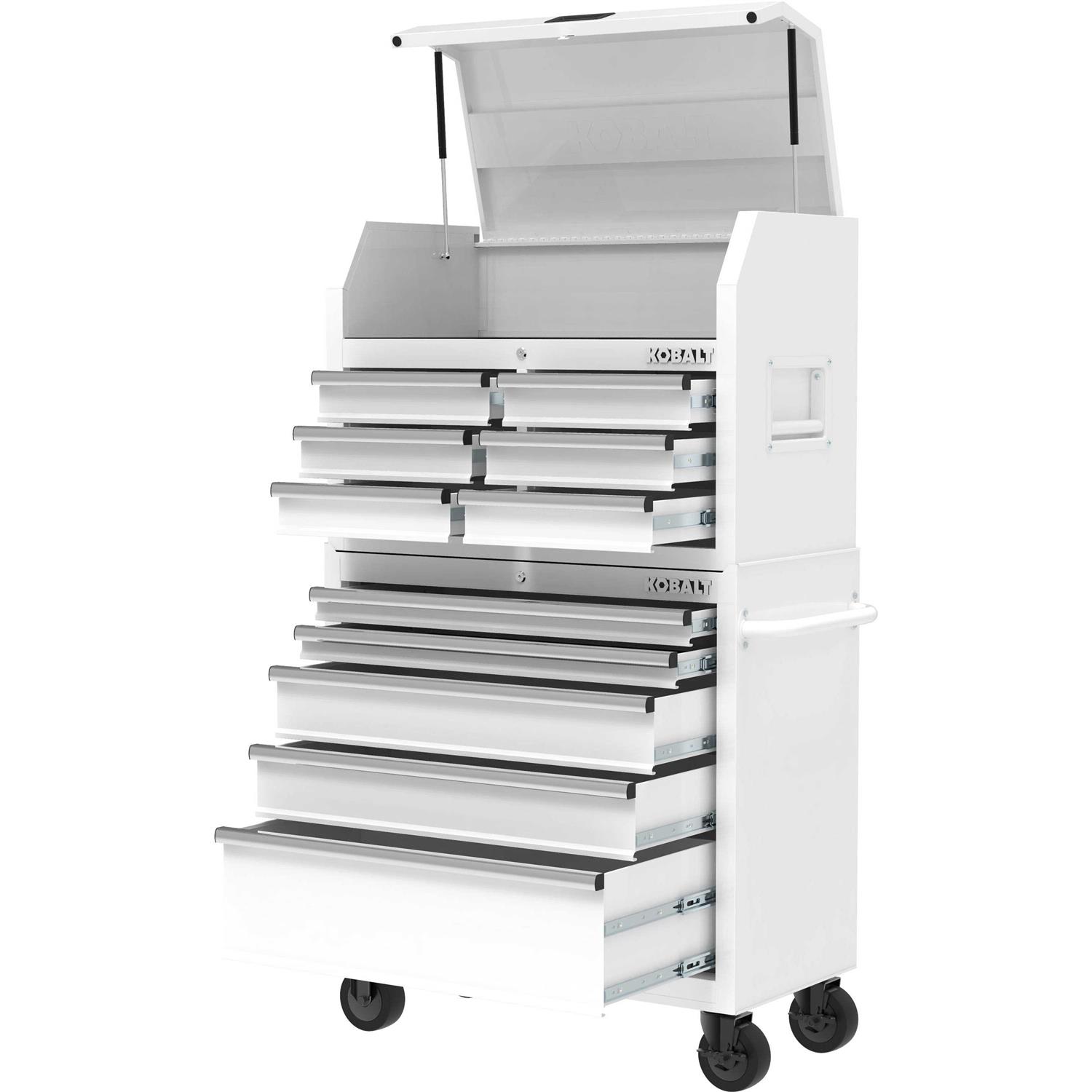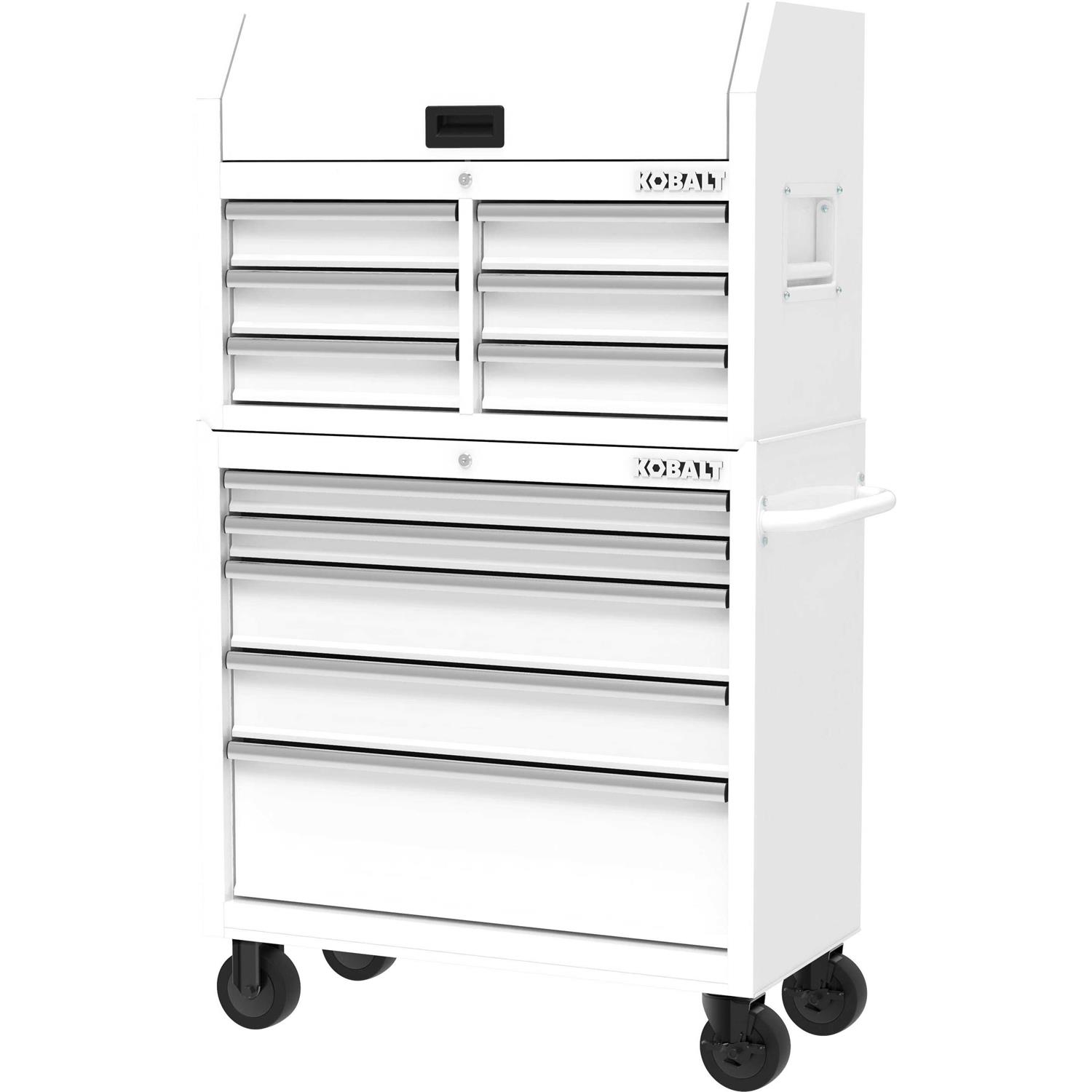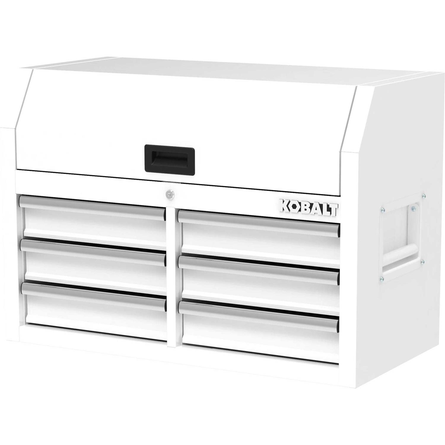 The Kobalt 36-In 6-Drawer White Chest is great for storing and organizing all your tools and hardware. The unit is made from high grade all welded steel construction with a tough, rust-resistant powder coat finish. 6 Drawers are all soft-close full-extension and glide effortlessly on ball-bearing slides that can support up to 100 lbs. you can charge your electronics and power tools even when the chest is locked via the integrated power strip with 4-outlets and 2-USB ports. The chest has lock system for added security. Pair this chest with the Kobalt 36-In 5-Drawer White Cabinet (item: 5215658, sold separately) to create the ultimate tool storage solution.