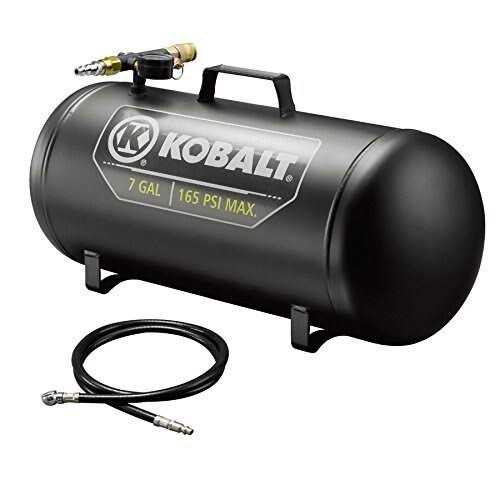 Unique design serves multiple purposes. Adds air to tires with included 4-ft high-pressure hose with ball chuck. Expands compressor capacity by acting as a reservoir between compressor and tools. Works as portable air supply for nailers and staplers. 1/4-in coupler at outlet attaches to any air hose. 7-Gallon tank can be filled via 1/4-in quick-connect port or Schrader valve. Drain valve for removing condensation from tank. 165 Maximum PSI.