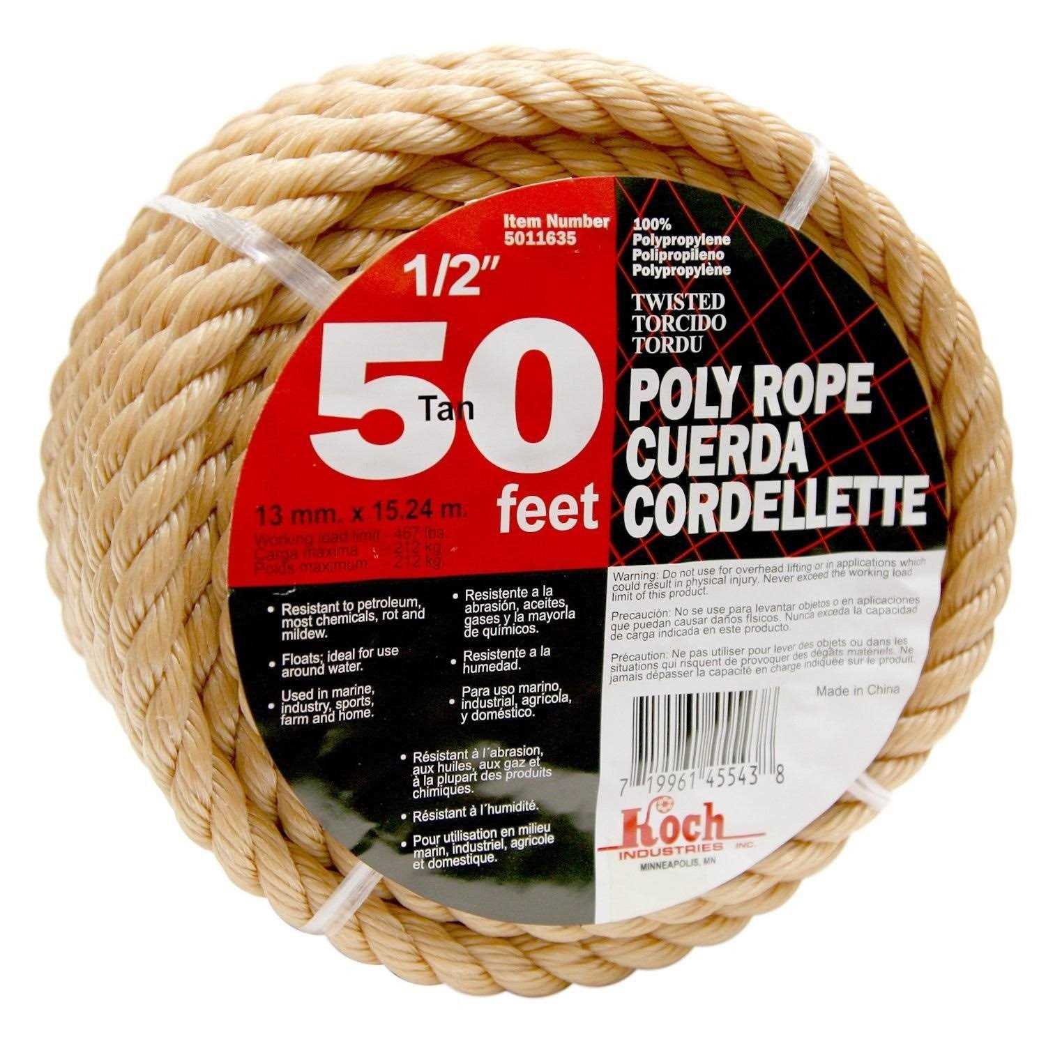 Polypropylene rope has a low stretch, good knot retention and is resistant to oils, rot, mildew and most chemicals. This rope can float and is ideal for use around water. General uses include swimming pool markers, camping and marine applications. general uses include swimming pool markers, camping and marine applications. Polypropylene rope has a low stretch and good knot retention. Resistant to oils, rot, mildew and most chemicals. Color is tan and trade size is 1/2 by 50 feet. The safe work load limit for this item is 420 lbs. General uses include swimming pool markers, camping and marine applications Polypropylene rope has a low stretch and good knot retention Resistant to oils, rot, mildew and most chemicals Color is Brown and trade size is 1/2 by 50 feet The safe work load limit for this item is 420 lbs.