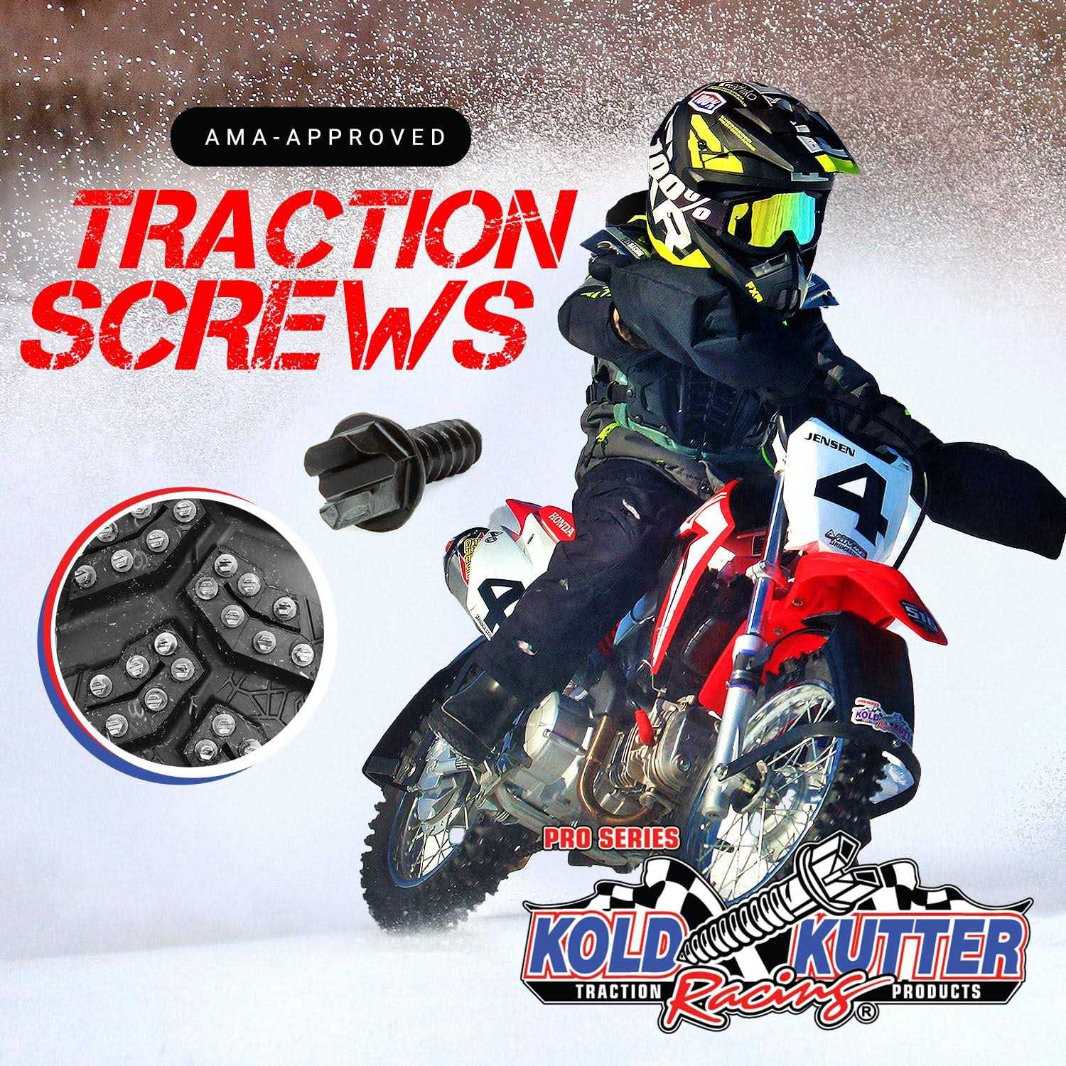 THE PRO’S CHOICE FOR AMA-LEGAL ICE RACING: Kold Kutter Traction Screws have been the top choice of ice racers and tire builders for over 55 Years – Featuring an aggressive, powerful bite while meeting every regulation for AMA Ice Racing V-CUT HEAD FOR UNBEATABLE TRACTION: Your Kold Kutter dirt bike ice studs are crafted with our signature V-Cut Head that gives you two-bladed surfaces on each screw head – This is the secret to unbeatable traction on your outdoor adventures HIGH-SPEED CONFIDENCE ON SLIPPY TERRAIN: Kold Kutter Traction Screws are designed to take you where no one else dares to go – you’ll feel confident taking on the most intense terrain without pumping the brakes IF YOU NEED TRACTION – your Kold Kutters give you traction wherever you need it VIBRATION-LOCKS (NO MORE LOST SCREWS): These winter tire traction screws feature vibration-locking teeth underneath the screw head to keep your Kold Kutters tight against your tires so you won’t worry about losing screws during fast-paced races Kold Kutter AMA-Approved Traction Screws (#8 3/8″