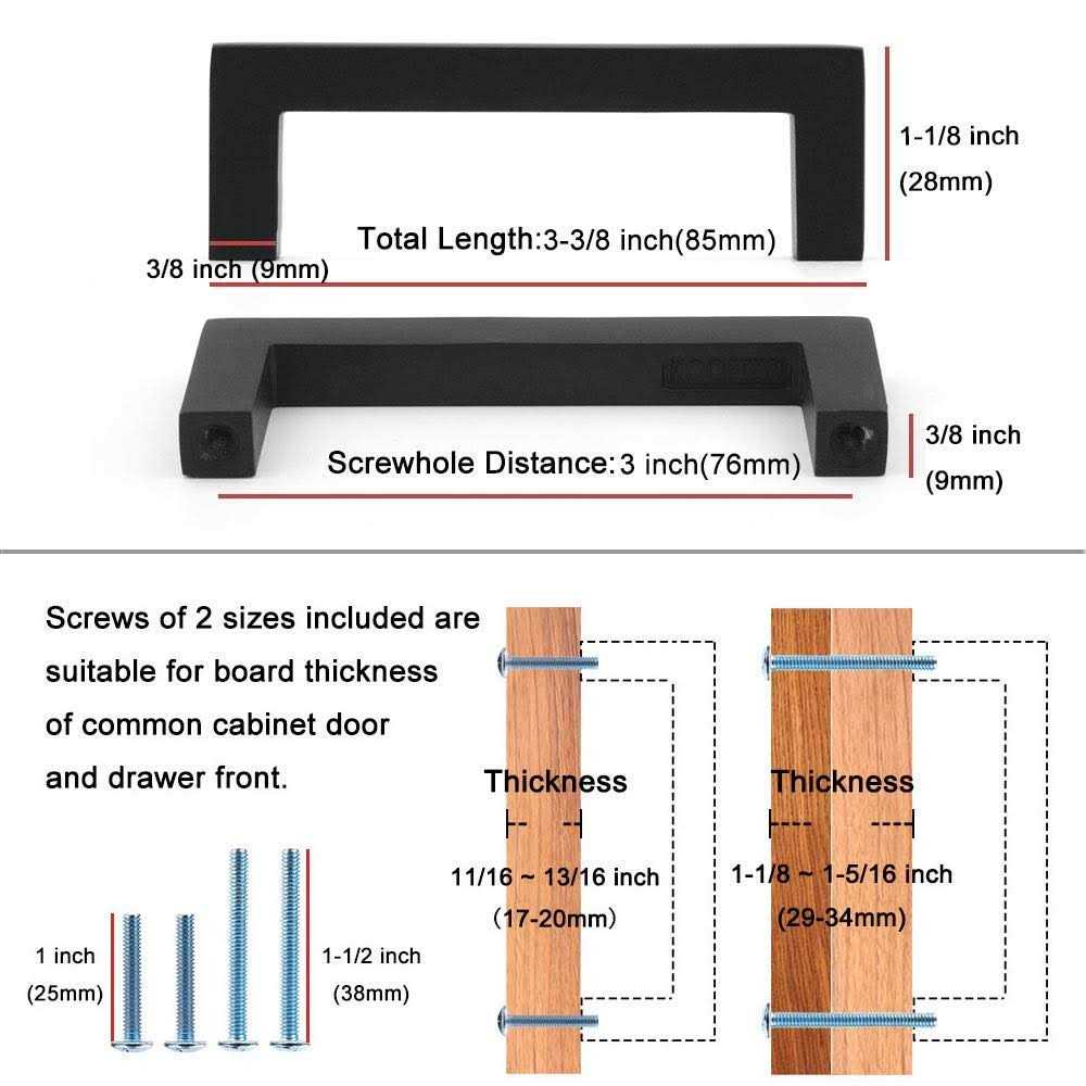 • Free screws of 25mm & 38mm included are suitable for board thickness of common cabinet door and drawer front.