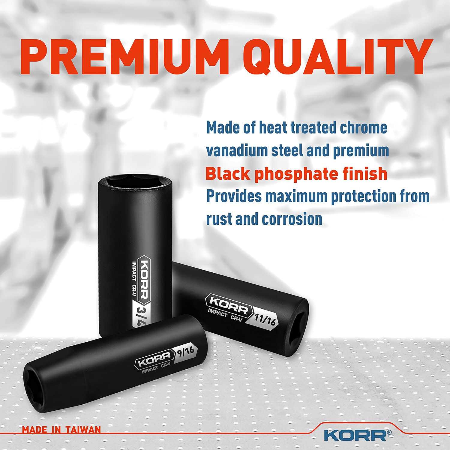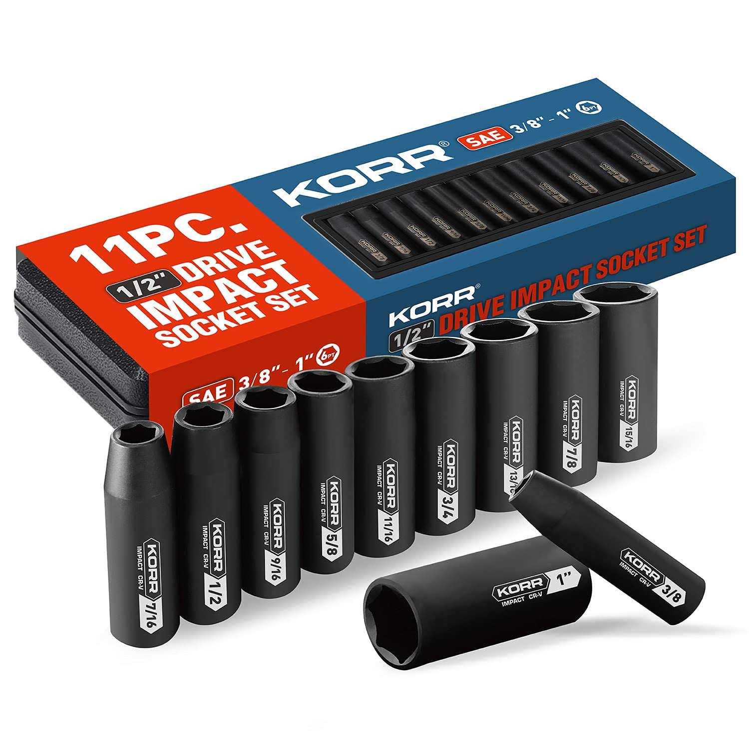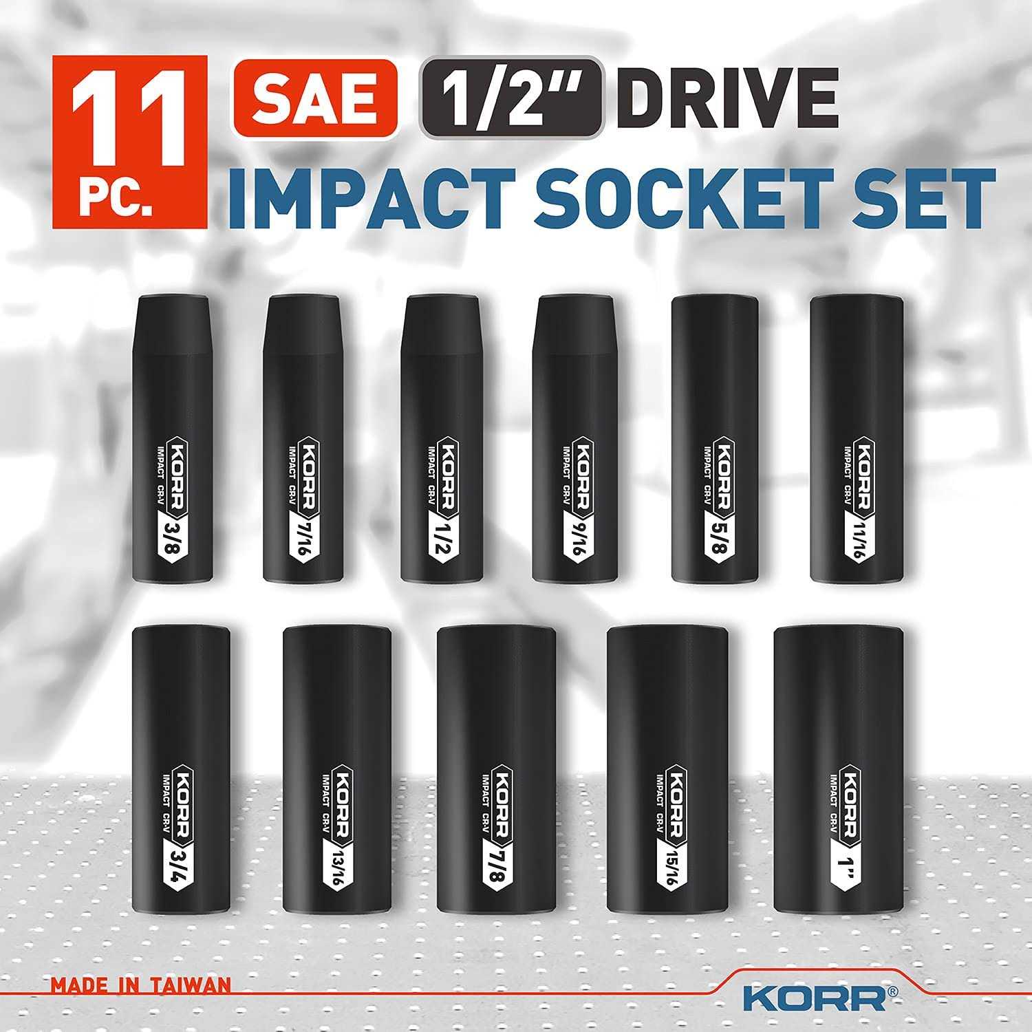 Korr Tools KSS001 11pc Impact Socket Set, 6-Point, 12-Inch Drive SAE Deep Socket Set