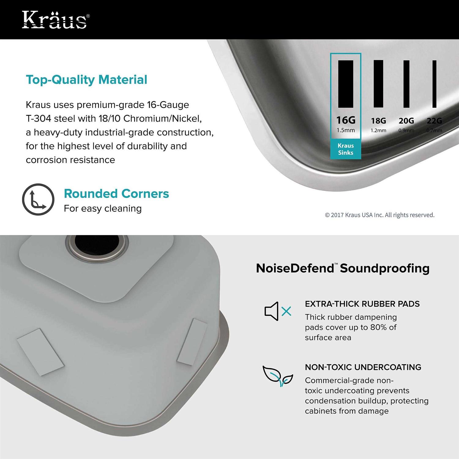 Kraus Undermount Single Bowl 16-Gauge Kitchen Sink with NoiseDefend, Stainless Steel, 20-3/4″