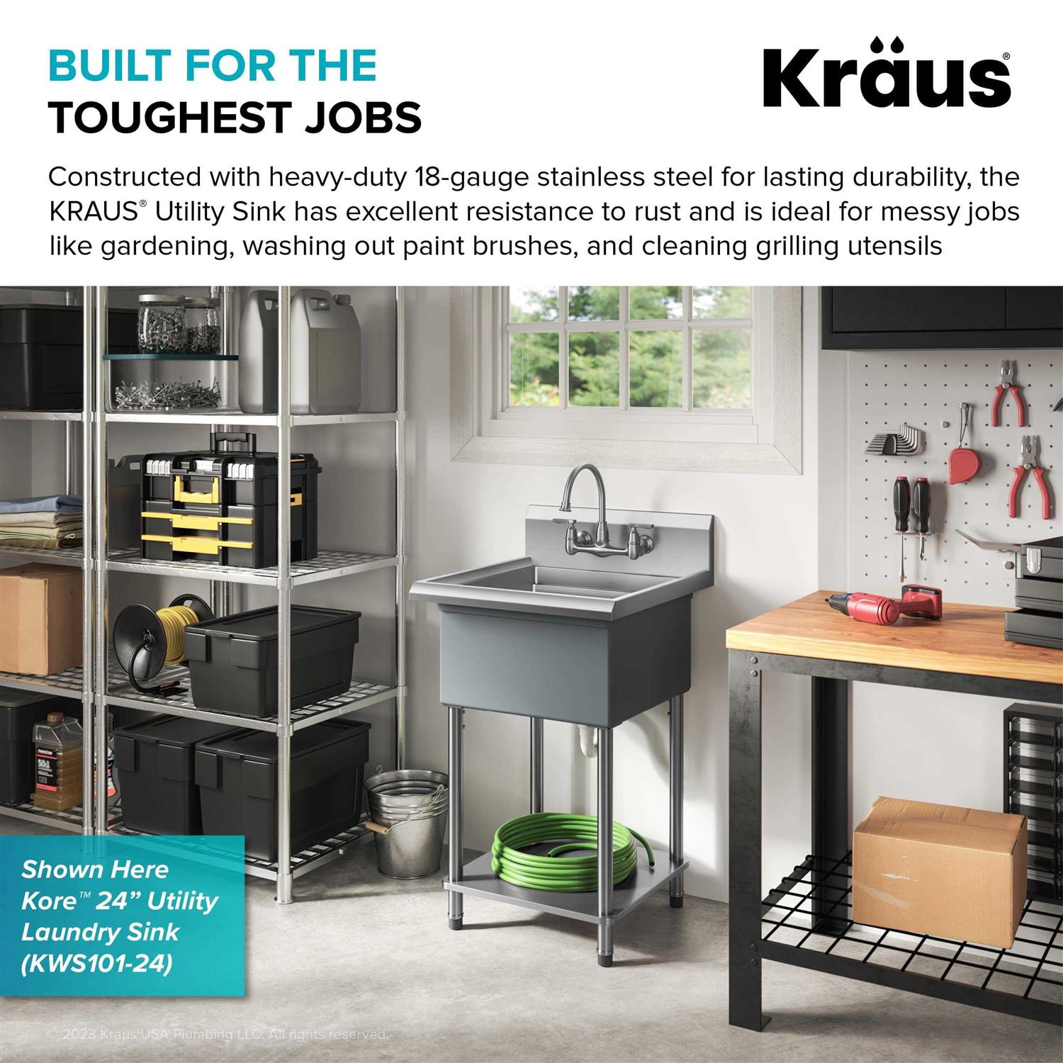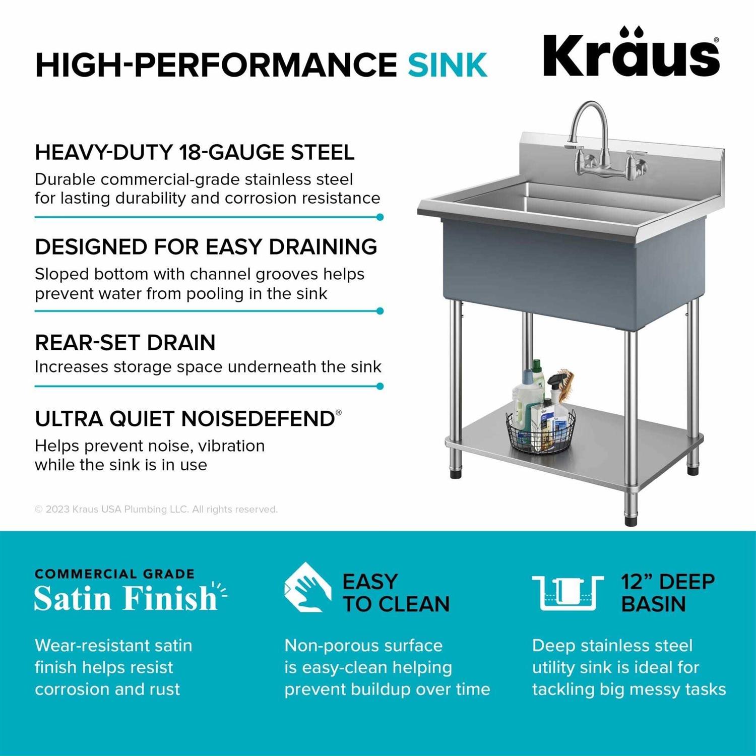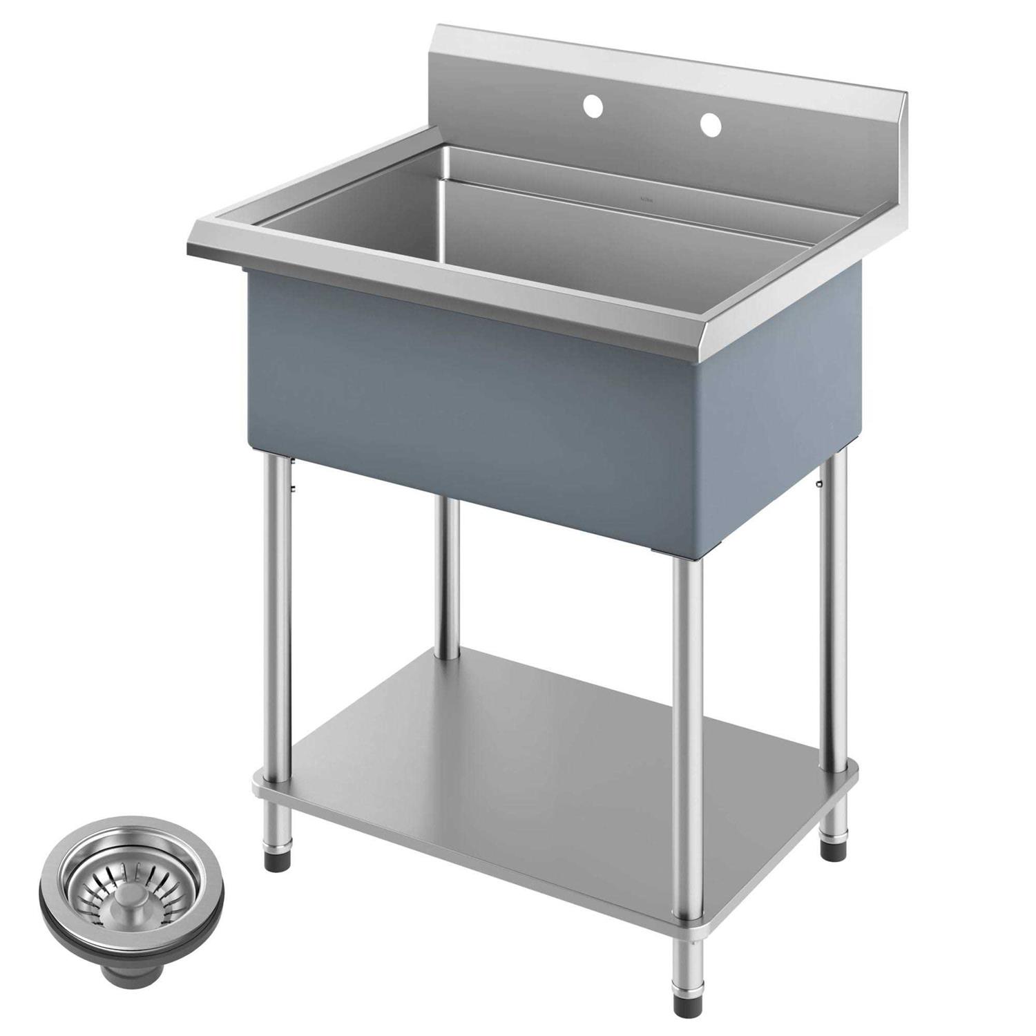 Built with commercial-grade stainless steel, the Kraus Kore Workstation Utility Sink is built to meet the needs of any professional kitchen, workshop, laundry room, and scullery. The deep single bowl with generous dimensions is designed with an integrated ledge for sliding accessories that allow you to work over the sink. Integrated bottom shelf provides storage area and reinforces the assembly. Adjustable stainless steel legs with skid-resistant feet are ideal for uneven surfaces. NoiseDefend soundproofing reduces noise and vibration. Wear-resistant finish is easy to clean and not prone to corrosion. Two pre-drilled holes allow for installation of wall mount faucet. Comes with drain assembly and removable strainer.