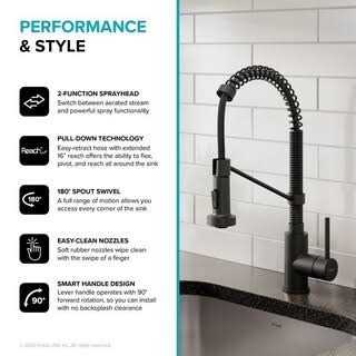 This Bolden commercial-style faucet by KRAUS creates a captivating industrial look with a high-arc open coil spout, and offers the advantage of a compact 18” height that fits underneath most kitchen cabinets. Highly functional in design, it features a pull-down spray head with Reach technology for superior maneuverability and an extended range of motion, allowing you to reach all around the kitchen sink. The dual function sprayer switches between an aerated stream for filling pots and pitchers, and a powerful spray to rinse dishes and wash away stubborn food residue. Ensure long-lasting worry-free use and installation convenience with its heavy-duty construction and premium components along with being pre-attached with waterlines with all mounting hardware included. Experience Kraus Quality in your own kitchen, and Go Bold with Bolden .