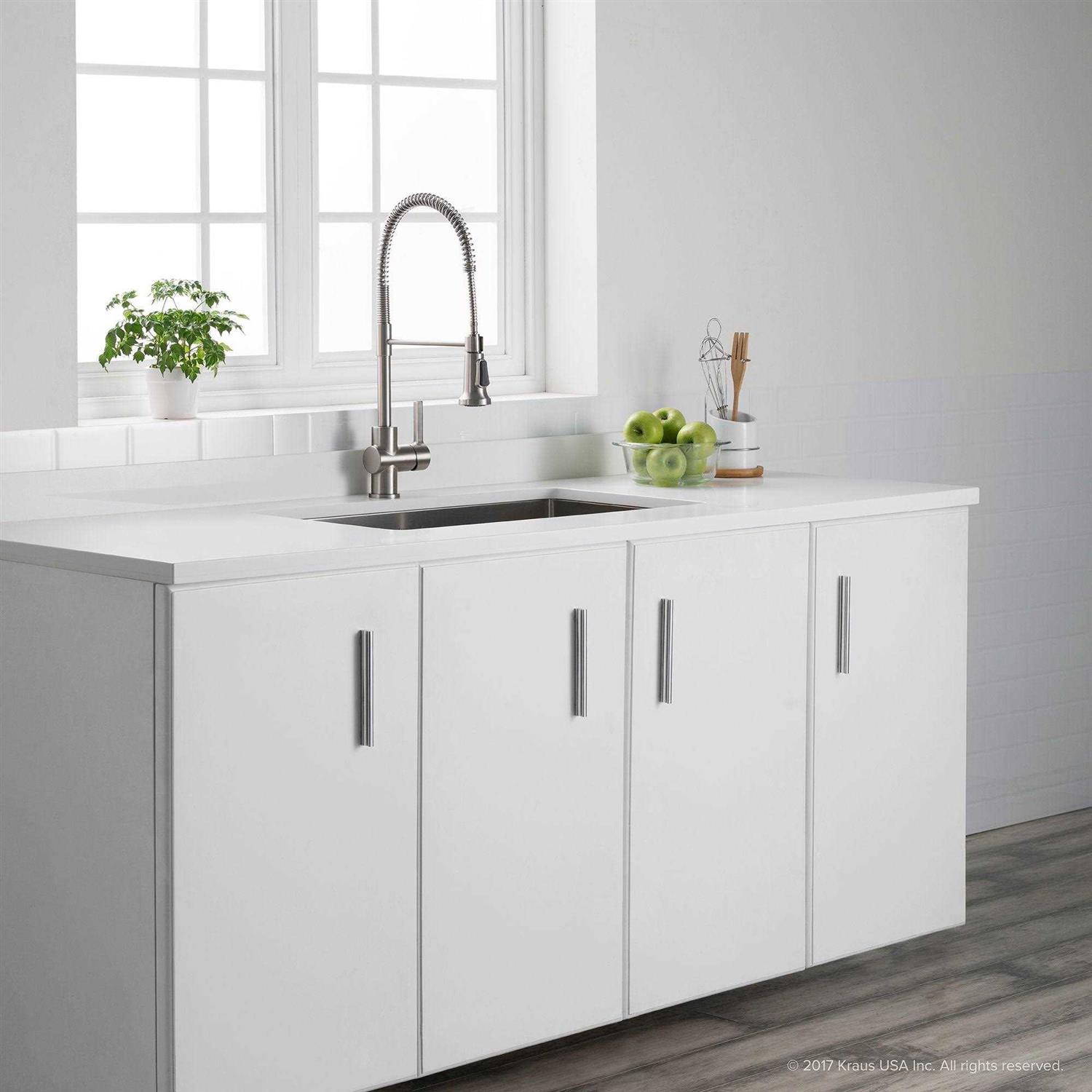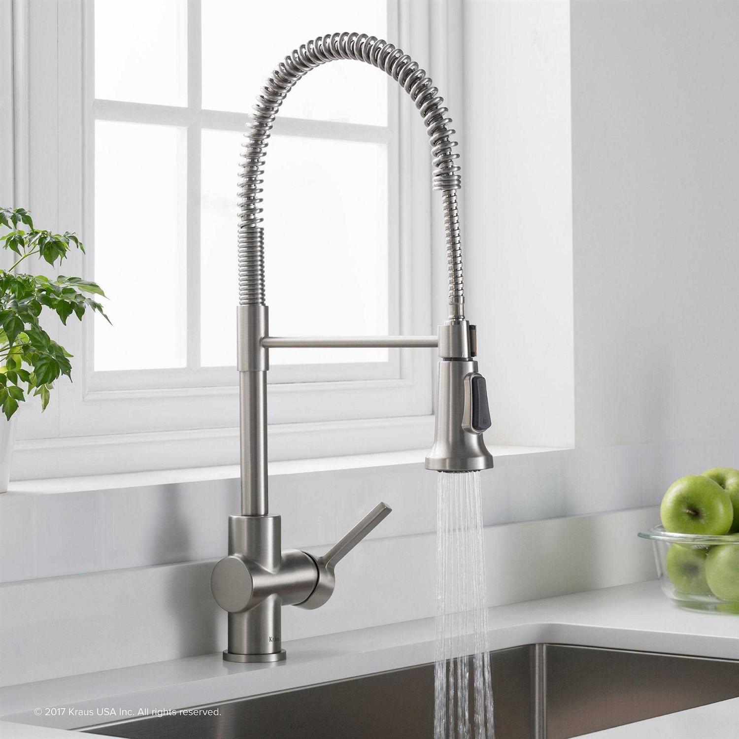 Inspired by the design of a professional kitchen, the Britt KPF-1690 commercial faucet blends performance and style to help you build the kitchen of your dreams. The sleek contemporary design features a flexible, commercial-style open coil spring spout with stainless steel hose and secure docking arm. The dual function sprayhead with large non-slip rubber button switch allows you to easily shift between 2 functions, with an aerated stream for everyday cleaning, and a powerful spray for heavy-duty rinsing. Soft rubber nozzles make the sprayface easy to clean and maintain a lasting powerful flow.
