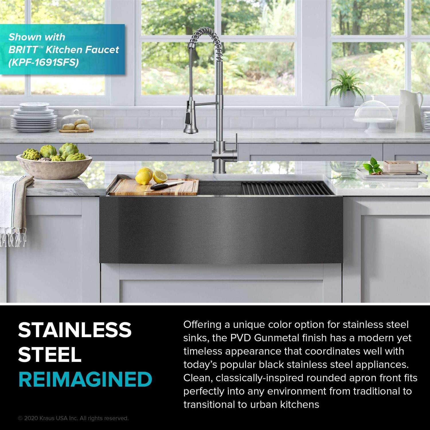 Kraus KWF210-33/PGM Kore Workstation 33 inch Farmhouse Apron Front 16 Gauge Stainless Steel Single Bowl Kitchen Sink in PVD