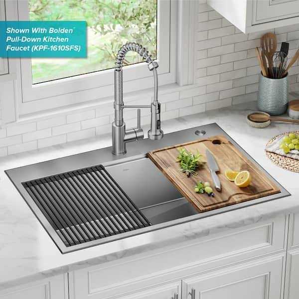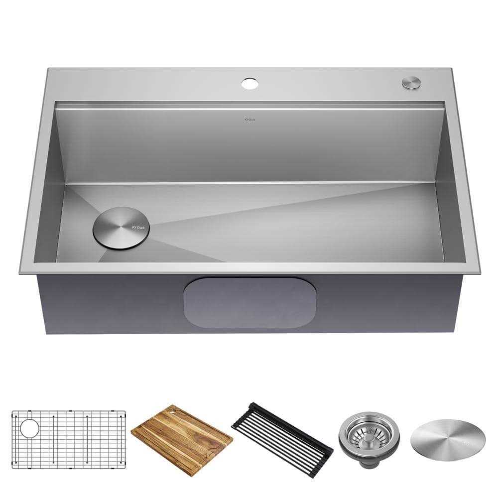 Kraus Loften 33 in. Drop-In/Undermount Single Bowl Stainless Steel Kitchen Workstation Sink with Accessories, Silver