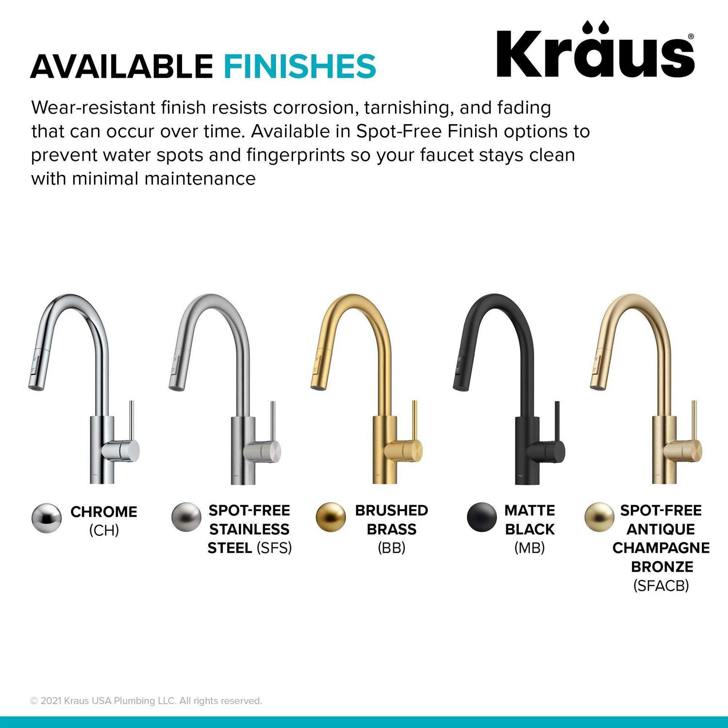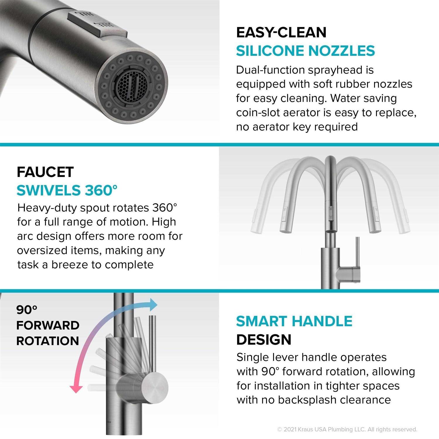 Kraus Oletto Single Handle Pull Down clean and contemporary kitchen faucet is ideal for any kitchen sink. It’s Spot-Free all-Brite Stainless Steel Finish prevents water spots and fingerprints so faucet stays flawlessly clean, with no need to wipe after each use. It features Reach Pull-Down Technology which supports an easy-retract flexible hose with swivel adapter. This offers an extended range of motion with the ability to flex, pivot, and reach all around the sink. Its GlideAssure Technology sprayer hose effortlessly glides in and out of the faucet with minimal wear and tear on the spout. The QuickDock drop-in base allows you to install in minutes with no need to go underneath the sink. This Eco-Friendly Faucet provides a Water-saving aerator that reduces water waste without sacrificing pressure.