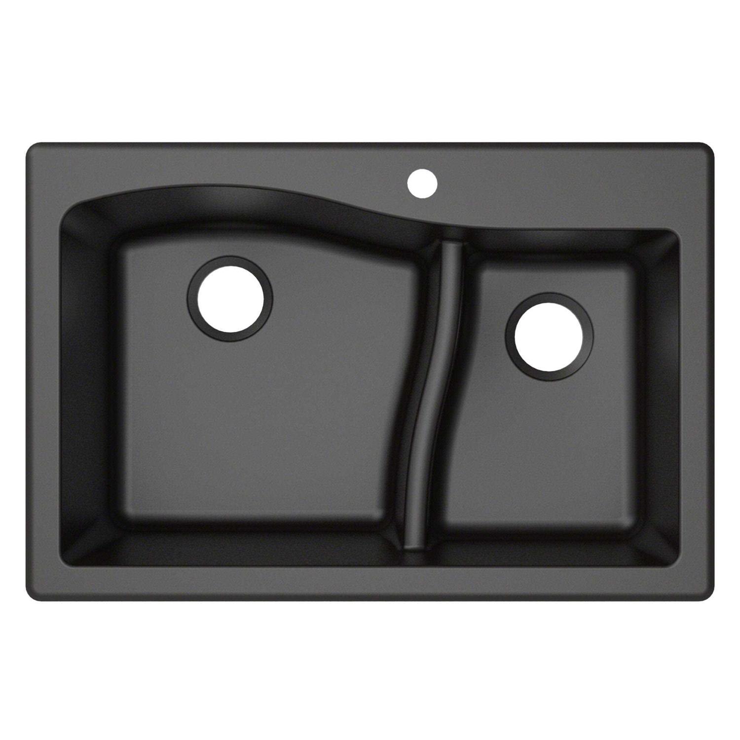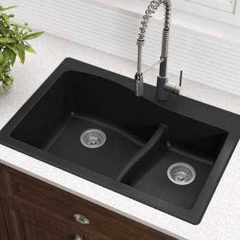 Built to last a lifetime, the Quarzaand#8482; 33″ Dual Mount 60/40 Double Bowl Granite Kitchen Sink by Kraus constructed with high-quality granite composite made from 80% natural quartz and high-performance acrylic resin, offering exceptional durability with the luxurious look and feel of real stone. The versatile dual mount design allows for undermount or drop-in installation, and is compatible with all countertops. The extra-tough material offers unparalleled resistance to scratches and stains, thermal shock, and impact from dropped objects. The naturally hygienic non-porous surface resists food and liquid from sticking for easy cleanup, and withstands extreme temperature fluctuations to handle hot pots and pans. Heavy-duty construction absorbs vibration and minimizes noise when the sink is in use.