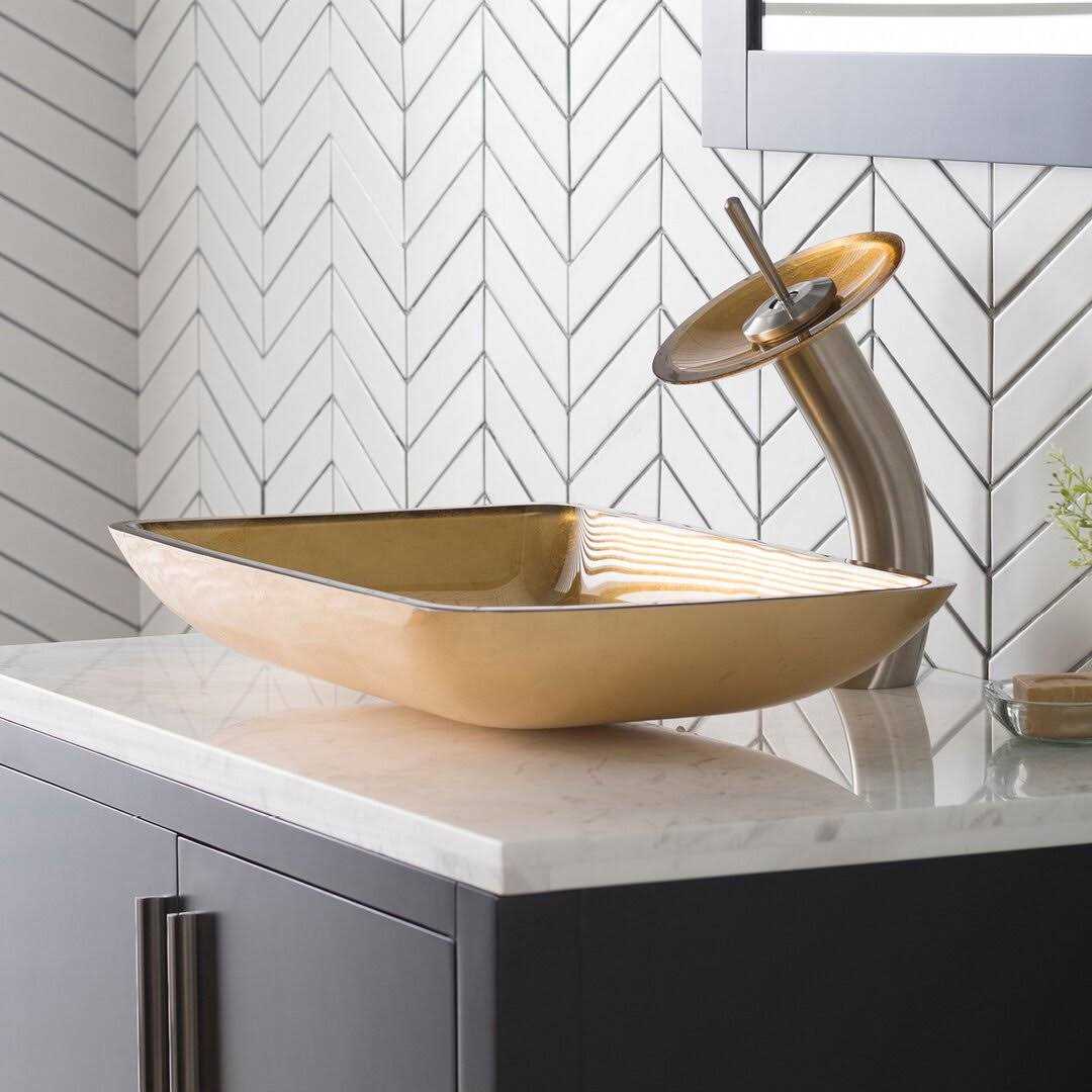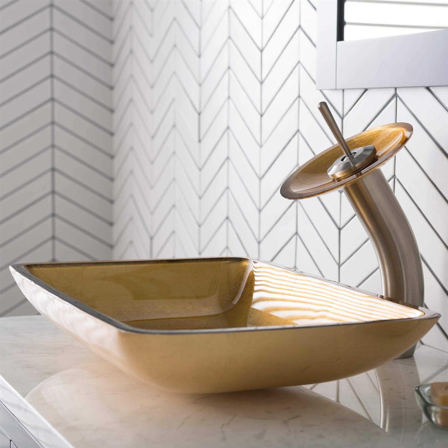 Kraus Golden Pearl Rectangular Glass Vessel Sink and Waterfall Faucet – Satin Nickel