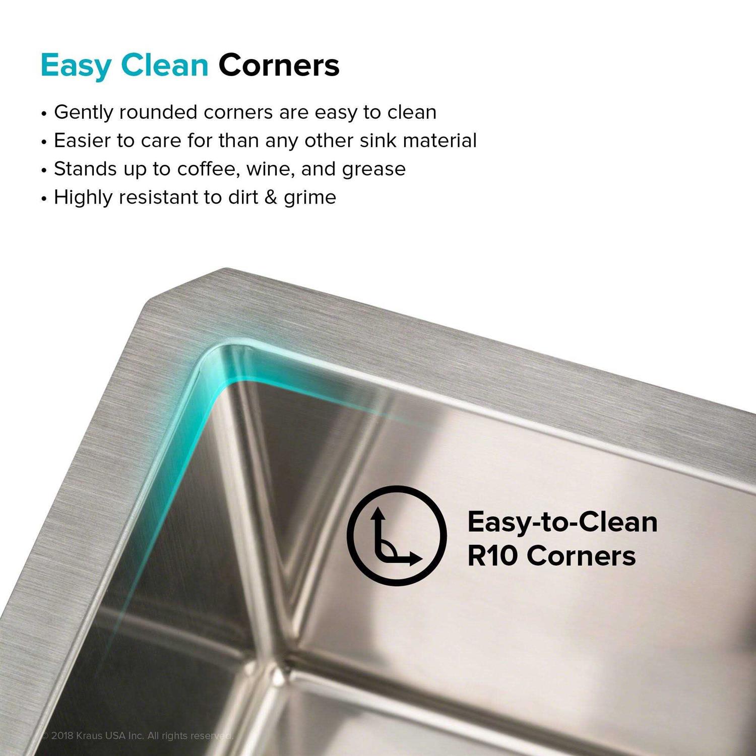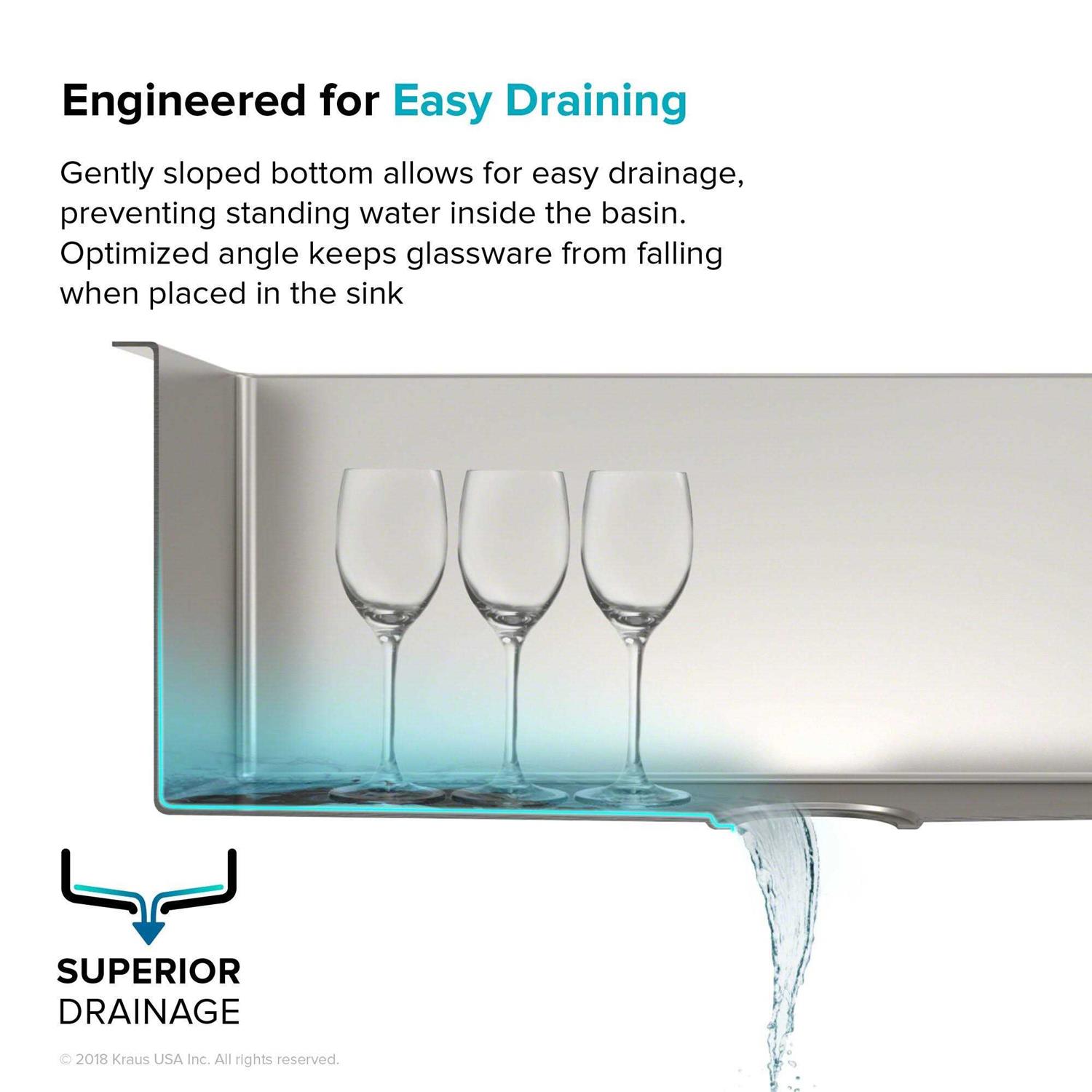 Enjoy the advantage of high-end sinks with clean contemporary designs that are at home in any kitchen. Oversized bowls with easy-to-clean corners easily accommodate your largest cookware including baking sheets, skillets, and more. So go ahead and host that dinner party Your sink can handle it all! Sinks made from extra-tough T304 stainless steel for exceptional resistance to corrosion and rust, featuring resilient dent-resistant TRU16 construction. TRU16 real 16 gauge is extremely sturdy, and always 1.5mm thick for a sink that is highly durable and long-lasting. Engineered for complete drainage, with a gently sloped bottom that prevents standing water inside the bowl. Optimised angle keeps glassware from falling when placed in the sink. Gently rounded corners maximise workspace in the sink bowl and offer a sleek contemporary look that is still easy to clean. KRAUS exclusive NoiseDefend soundproofing technology absorbs vibration and minimises noise when the sink is in use. Extra-thick sound-absorbing pads cover over 80% of sink base to absorb noise from dish washing and waste disposal. Engineered to enhance sound-deadening and improve insulation, for a quieter kitchen experience. Prevents condensation build-up that can damage kitchen cabinets.