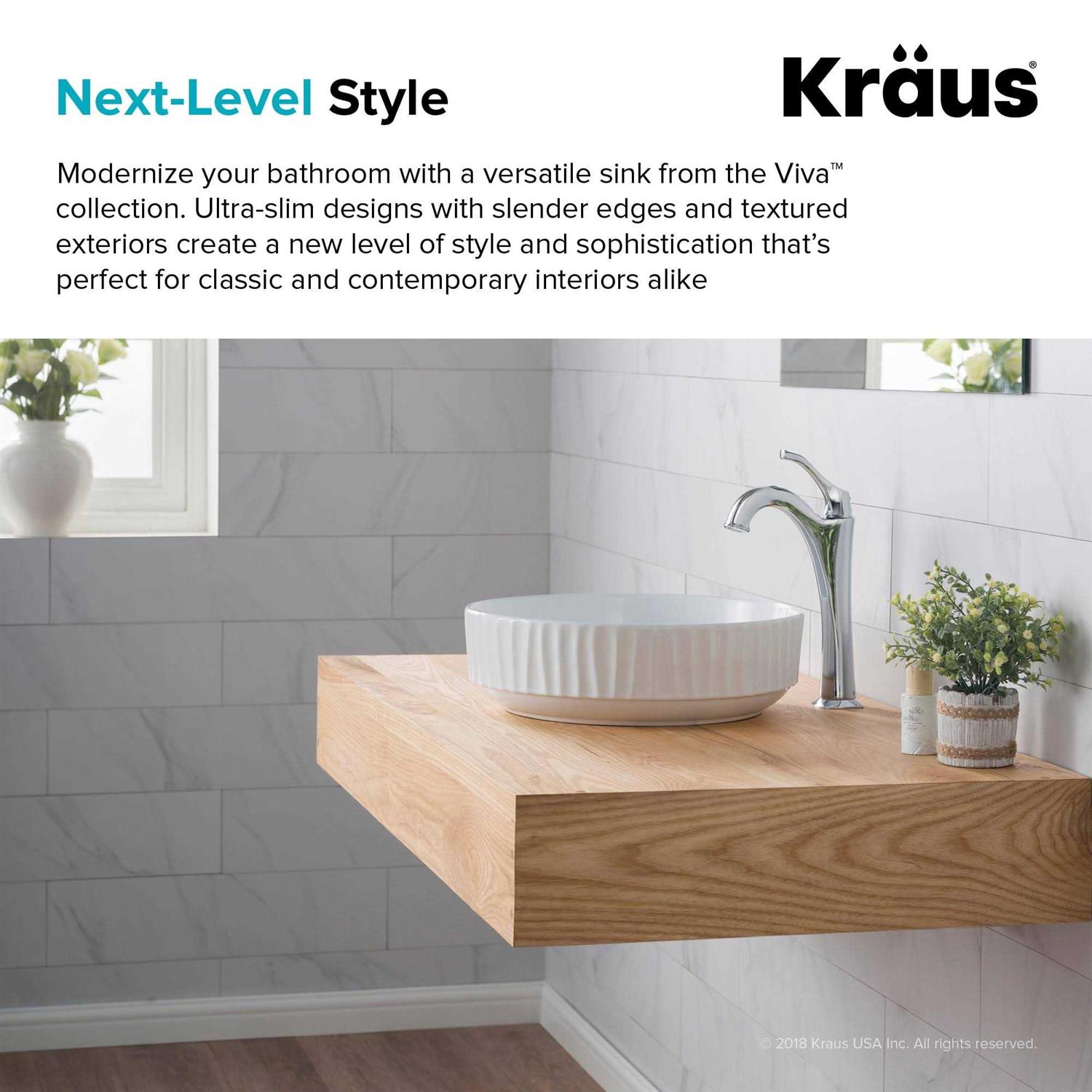 Kraus Made from high-tech vitreous china, the vessel sink exemplifies the stunning union of expert craftsmanship and contemporary style. Using proprietary molding technology that allows for ultra-slim edges without sacrificing an ounce of durability, the vessel sink adds a hint of modern appeal to the timeless charm of ceramic bathroom sinks. The naturally hygienic non-porous ceramic sink surface is impervious to bacterial growth and is fired at high temperatures for a high-gloss finish that?? s scratch and stain-resistant. The easy above counter installation allows you to update your bathroom sink without replacing the entire vanity. To complement any decor, Viva series sinks are available in a selection of on-trend colors, from classic white to subtle neutrals to bold modern black. A premium pop-up drain with a solid core ceramic top is included for a perfect match.