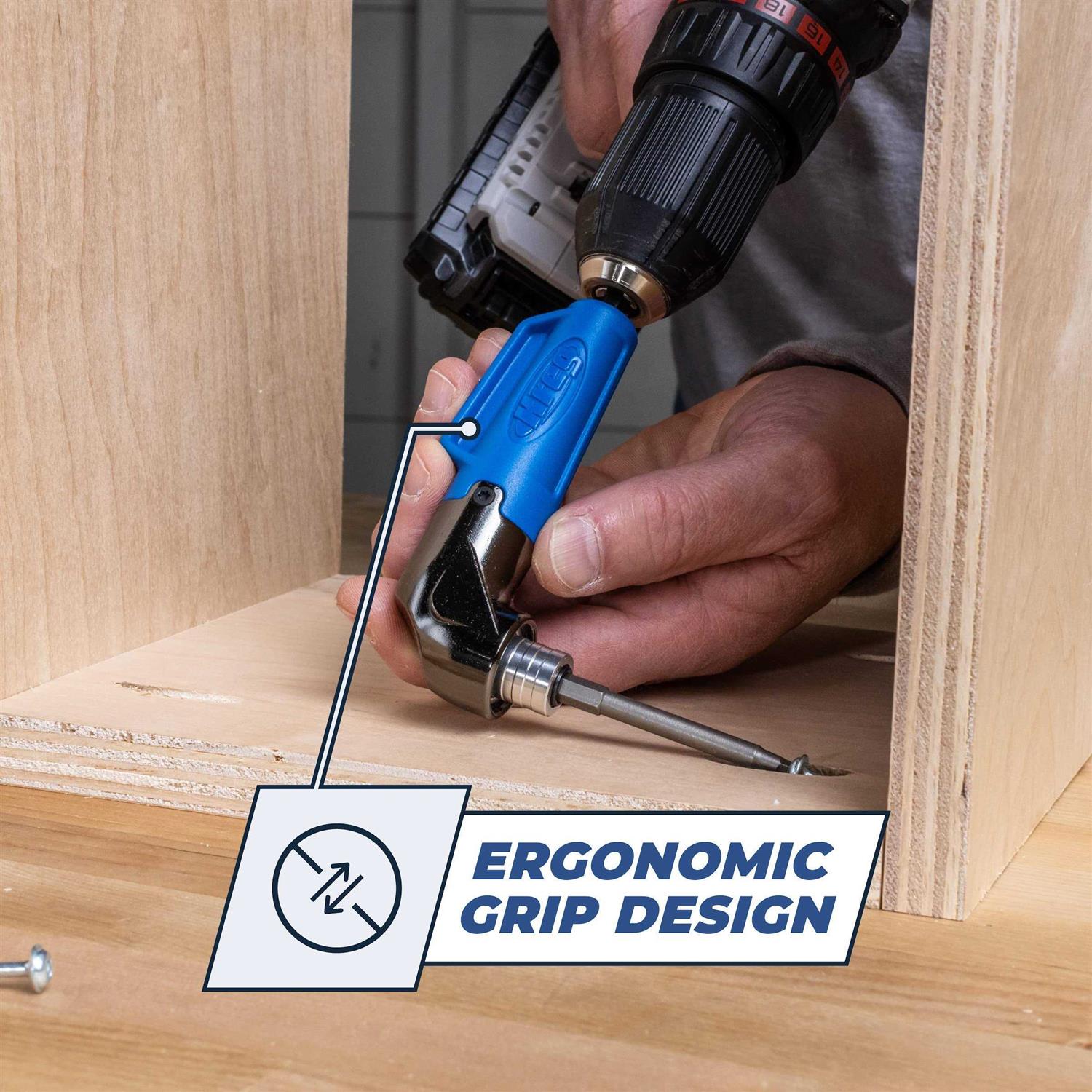 Key Featuresn–Drive screws in tight spaces with any hex shank bitn–Perfect for pocket-hole screwsn–Included 3u201D square-drive magnetic-tip bit locks in, wonu2019t fall outn–Ergonomic, easy-grip designn–Impact rated.nDescriptionnnTurn any drill into a 90u00B0 driver with the Kreg 90u00B0 Pocket-Hole Driver. This compact drill attachment allows you to drive screws in places you couldnu2019t normally reach with your drill.nThe included 3u2033 square-drive bit has a magnetic tip that locks into the head of a pocket-hole screw and wonu2019t slip out u2013 so you can drive screws with confidence, no matter where they are. This attachment works with all hex shank bits, making it great for more than just pocket-hole screws.nWith an ergonomic design, the 90u00B0 Pocket-Hole Driver is easy to hold in place with one hand while you control the drill with the other. Itu2019s also impact-rated for use with an impact driver. Whenever you need to drive screws in tight spac.