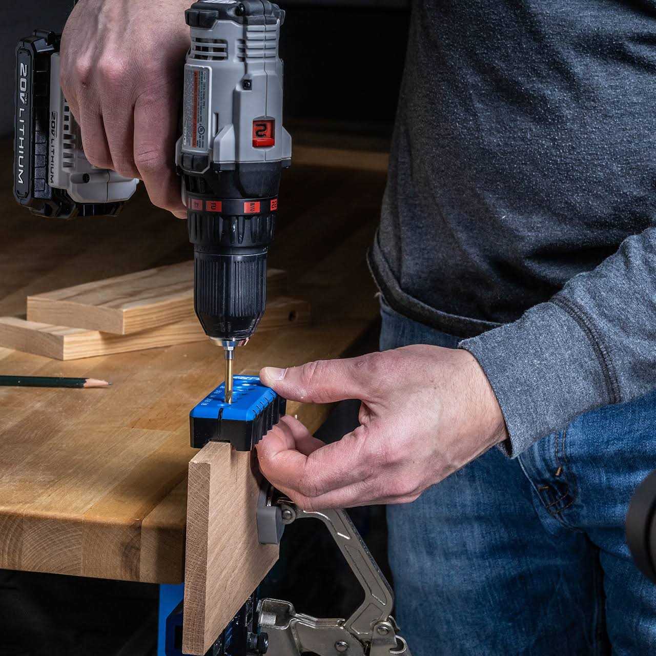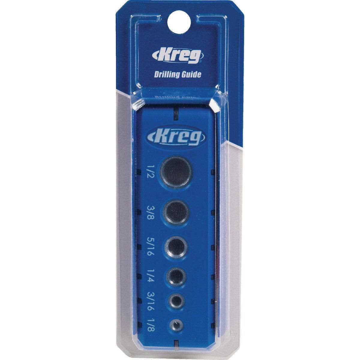 Drilling Guide The Kreg Drilling Guide makes it easy to create perfectly straight holes without using a drill press. You can get precisely positioned holes with just a hand drill. Featuring six hardened steel drill guides—from 1/8′ to 1/2’—that do the work of holding your drill in position for you. The Guide features an ergonomic design and Kreg GripMaxx material that ensures it stays in place as you use it, so your drill bit won’t wander off your mark as you start the hole. The Drilling Guide also automatically centers on the edge of 3/4′-wide and 1/2′-wide boards and plywood, so you can drill holes that are perpendicular to the edge and perfectly centered. Use the Drill Guide for all kinds of tasks – whether you need a hole for driving a screw, mounting hardware, helping create a dowel joint, and much more.