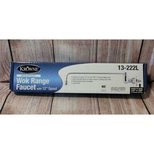 The Krowne 13-222L Silver Series Wok Range offers convenience, ease of use, and safety in your kitchen. Its 3/8″ male wok faucet and 12″ swing spout provide precise heat control and easy reach, while its silver series construction adds durability and reliability. Perfect for busy kitchens! 13‐222L Krowne Silver Series Wok Faucet, splash‐mounted, 12″ spout, 3/8″ inlet, low lead compliant Series Silver Series Mounting Style Wall Mount Centers Single Hole Spout Style Swing Spout Size 12″ Inlet 3/8″ NPT Male Mounting Kit Included Features Automatically turns on when spout is swung over wok Replacement Parts Available 20 pieces per case