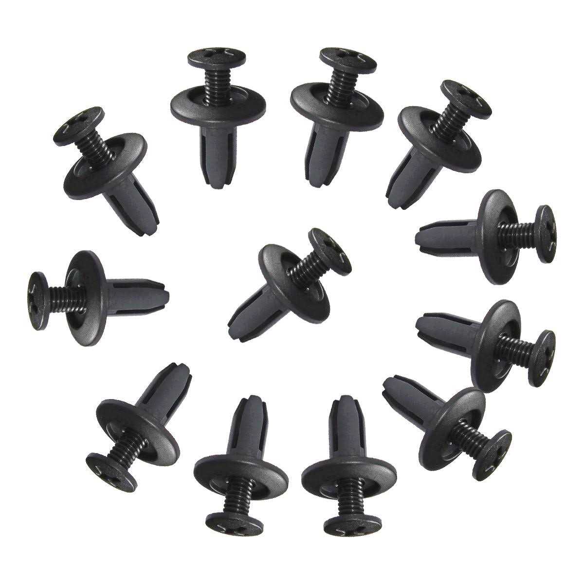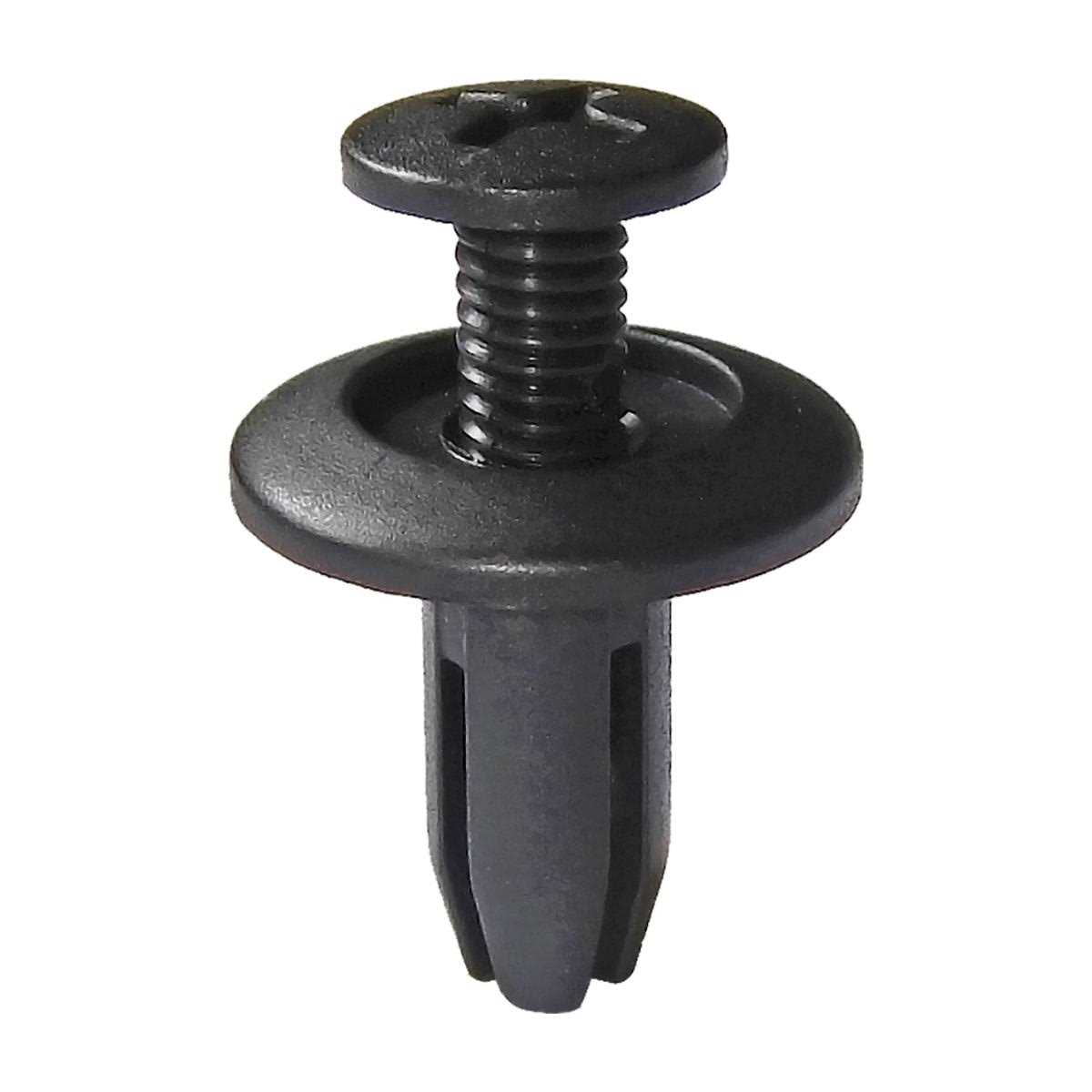 Rivet post pressure expands legs for fast and permanent fastening. Used widely for car fender, bumper, door or other car surfaces. Push in type, are made of the plastic material, fit 6mm diameter hole. Consisted of two parts(male and female part). Insert the female part into the hole, screw the male part to the bottom, closed position. To uncouple the two parts, unhook the male part by using a tool under its head.
