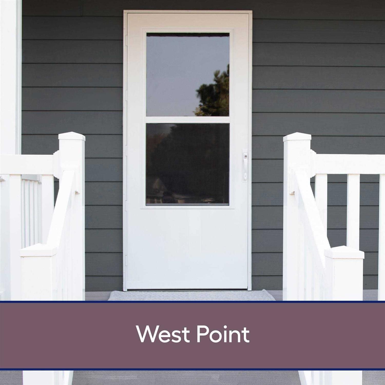 This is one heavy-duty door, engineered for durability and maximum protection. The West Point storm door features a commercial-grade closer with built-in torsion bar to prevent over extension, heavy duty handle, and five-hinge system. Tear-resistant screen withstands up to 300-lbs of force. Reversa Screen for top or bottom venting. Includes keyed heavy-duty handle designed for excessive use. Maintenance-free DuraTech finish surface over solid core with age and weather protection hides scratches and resists denting. FlexGuard closer protects against over-extension and helps prevent wind damage. Heavy-duty weatherstrip for energy efficiency. “EasyHang installation is fast and easy. offering a no cutting system with mounting rail extenders for an exact fit every time”. Universal hinge for right or left mounts.