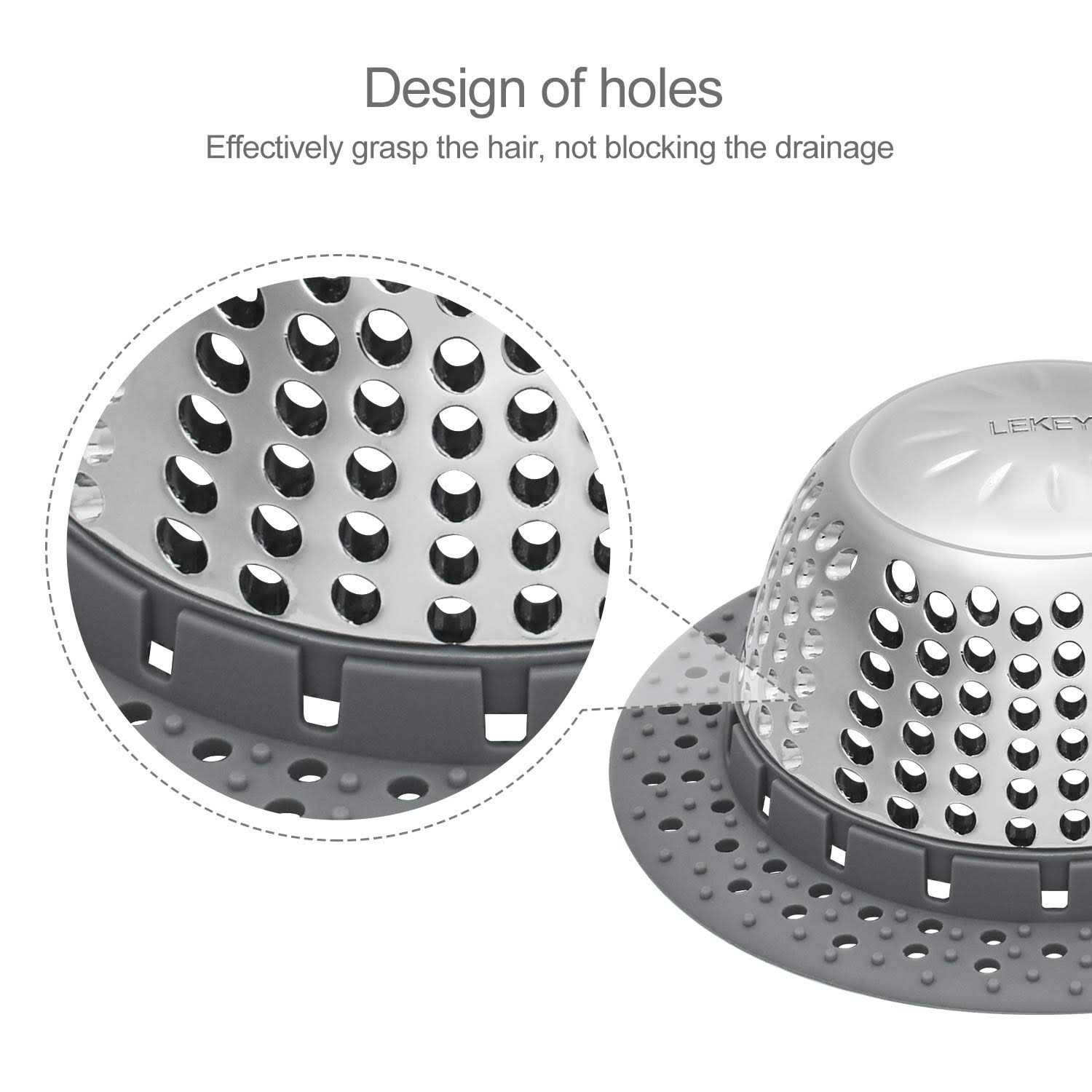 Features: nn–Free-Flowing Drainage It is a hard task for unclogging drainage. To ensure youre getting the right one, its important to consider the type of your drain. Our drain protector is tall and dome-shaped, you wont have to worry about this as its going to work well with flat and pop-up drains.n–Stainless Steel Dome & Silicone Rim Rustproof stainless steel construction is perfect accessory for wet environments like showers, sinks, bathrooms. Innovative high-quality silicone rim design can sit flush on drain and seal securely. LEKEYE is built for long-time use. No need to replace it for a very long time.n–Easy to Use Just put LEKEYE on the drain. No screws. No need to assemble or disassemble anything. The weighted stainless steel will keep it sta.