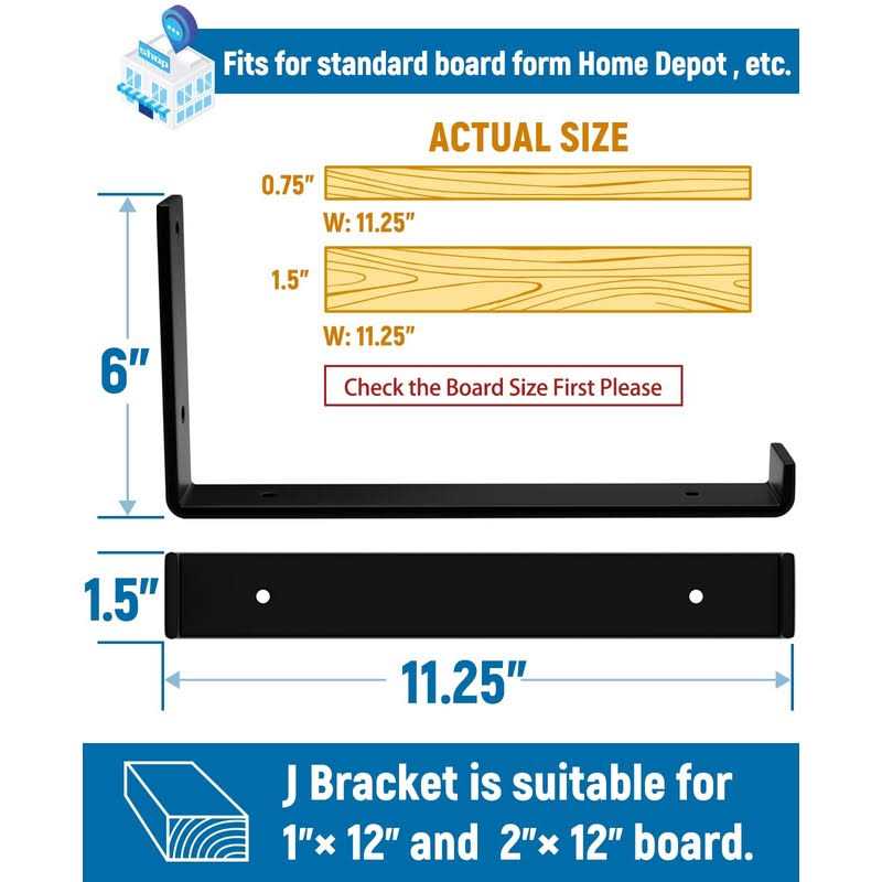 CHECK THE SIZE: This J shelf brackets fit the nominal 1x 12 and 2 x 12 (actual 0.75 x 11.25 and 1.5 x 11.25) lumber board, measure 11.25 x 6 x 1.5(broad is not included). : Unlike the normal painting material, power frosted black coating ensure its rust-resistance and anti-coating off. HEAVY DUTY: Each 5mm thick heavy duty steel shelf bracket with upgrade quality screws carry up to 80lb, enough for daily use. ALL-MATCH STYLE: Maximize space with with style. Ideal for the kitchen, bathroom, bedroom, office & more..,,LEOPO