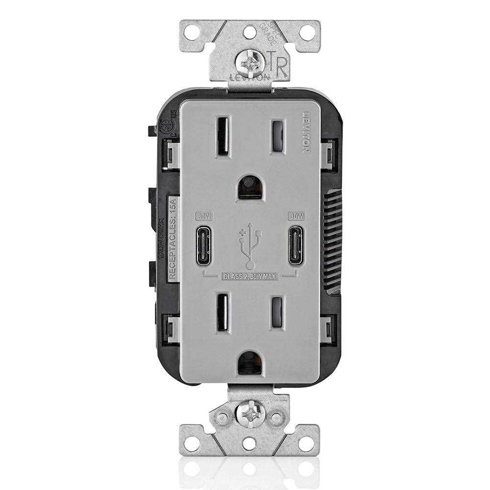 Leviton T5635-G USB Dual Type-C with Power Delivery (pd) In-Wall Charger with 15 Amp, 125 Volt Tamper-Resistant Outlet, Gray