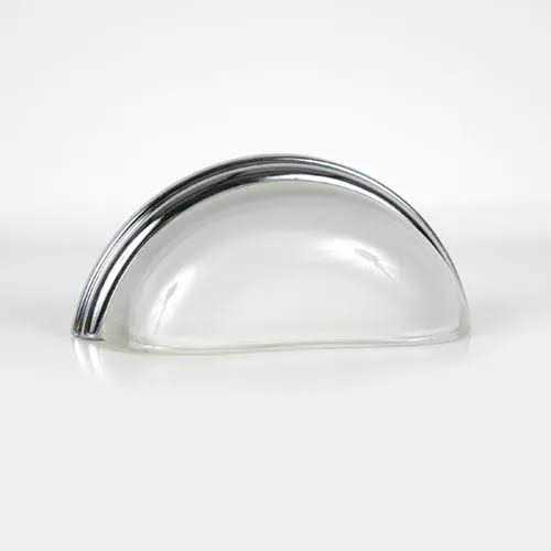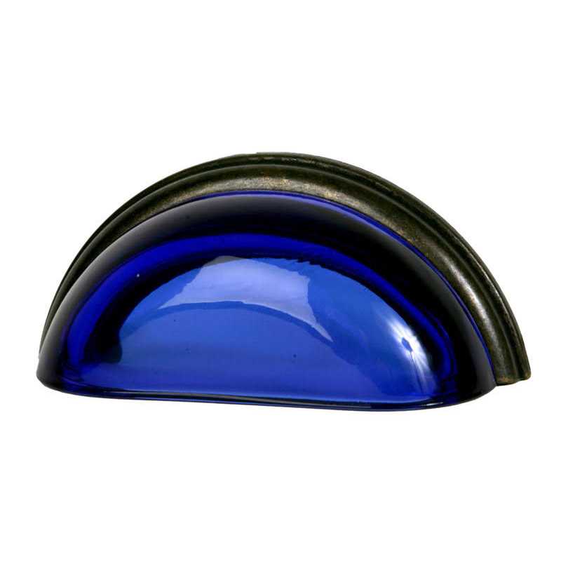 Easy to install with four 8-32 machine screws included. Can be used in tradition or modern setting. Slight variations in color may occur due to the nature of glass. Glass is hand poured. Transforms the classic cup-like bin pull. Die-cast zinc construction. Backplates not included. Transparent cobalt glass finish.