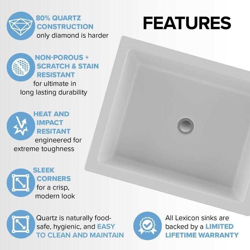 Why Lexicon Platinum? The Lexicon Platinum LP-V330 rectangle vanity sinks are constructed from 80% natural quartz, creating an incredibly durable and hygienic sink surface. Easy-to-clean and food-safe, quartz has the smooth feel of stone with superb sound-absorption properties and provides maximum protection against heat, scratches, and stains.
