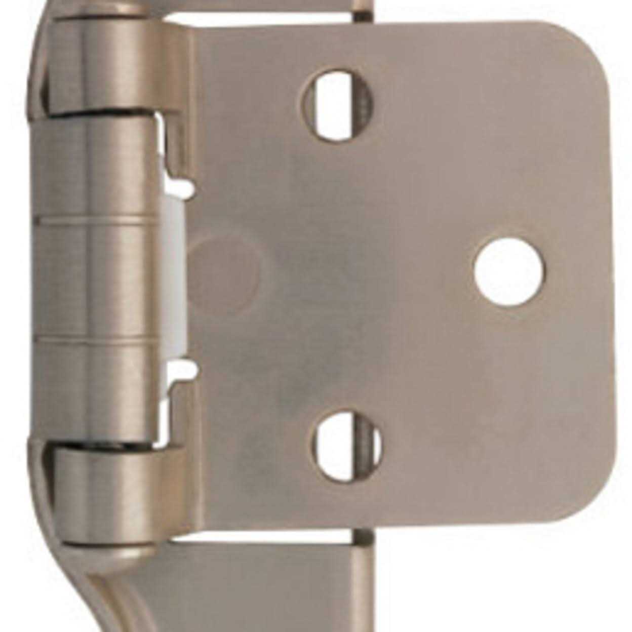 The Liberty Satin Nickel Semi-Wrap Overlay Hinge is made from sturdy steel material and requires little to no force for cabinet door closure. This full overlay hinge conveniently has a self-closing feature for your cabinet and vanity mounting projects. Made from steel with a brushed nickel finish.