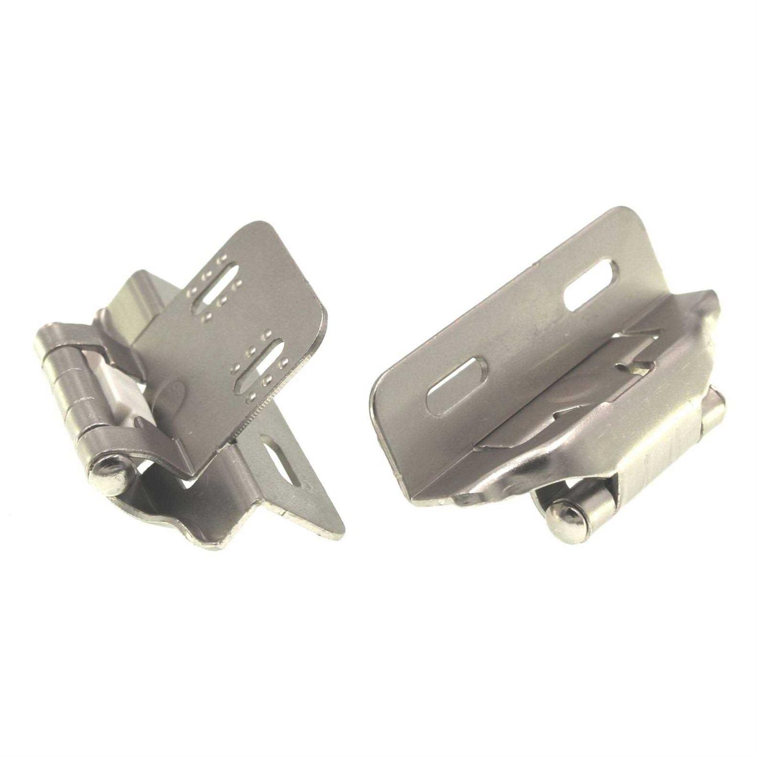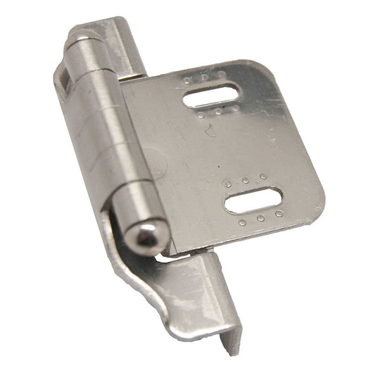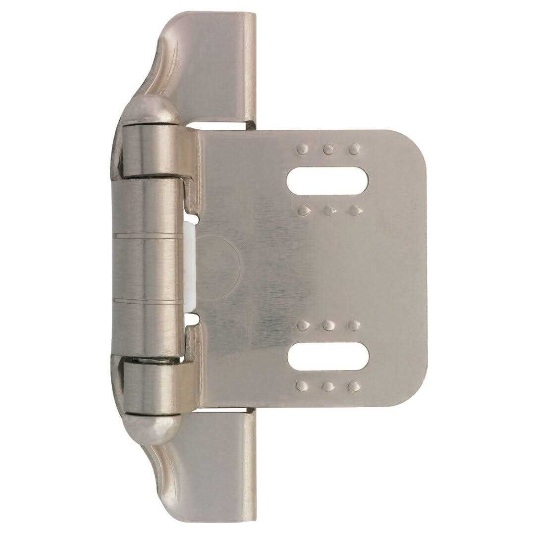 Satin Nickel Semi-Wrap Overlay Hinge has a self-closing feature that requires little to no force for cabinet door closure. A simple change can make a huge impact on the look of any room. Offers durability.