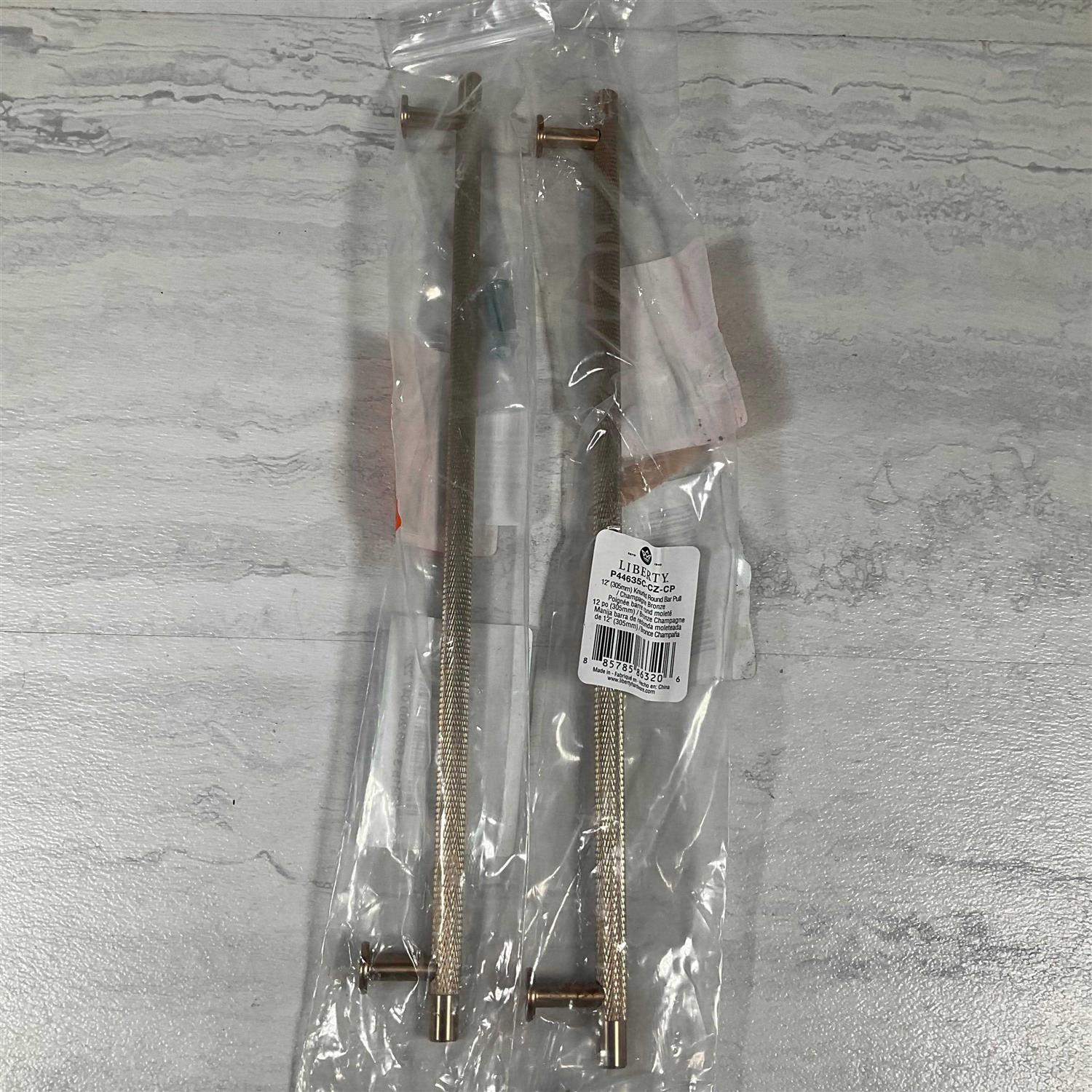 From Liberty is the knurled round cabinet collection. Featuring a crosshatched pattern that feels great in your hand and gives an industrial look and feel to your cabinetry. Simply install this hardware in your kitchen or bath and watch your cabinetry quickly transform. Casual hardware cabinet drawer pull in champagne bronze Drawer pull center-to-center is 5-1/16 in. between screws Includes (2) 1 in. screws to install drawer pull quickly Industrial in design, this collection has raw and rustic aesthetics that feel authentic and go great with appliances. Design is crafted of durable steel Champagne bronze finish gives your room a richly elegant brass tone that is uniquely modern and sleek 12 in. (305 mm) center to center screw mounting, rear-mount installation Safety weight rating is 75 lbs.