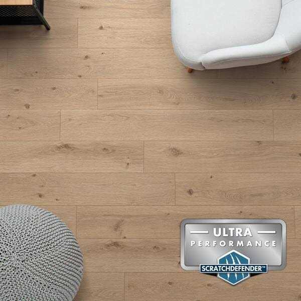 New Lifeproof Ultra Performance Hybrid Resilient Flooring is our most durable flooring against scratch and surface wear. With new SCRATCHDEFENDER technology, these planks are built with extreme scratch resistance that can stand up to high-traffic households or light commercial application. Our hybrid resilient flooring is waterproof, dent and gouge proof, and PVC free making this the perfect addition to any room in your home including kitchens, bathrooms, living rooms, or even sunrooms! Lifeproof Hybrid Resilient Flooring is an easy DIY or PRO installation with the pre-attached foam underlayment and click lock locking system. Planks feature a simple angle fold installation system that doesn’t require any tools for assembly. Lifeproof Hybrid Resilient Flooring is embossed to look and feel like authentic hardwood, just without all of the typical maintenance concerns. Cleaning is a breeze with 100% waterproof planks – wet, steam and jet mop approved. 100% Lifeproof. 0% worries. Color: Medium.