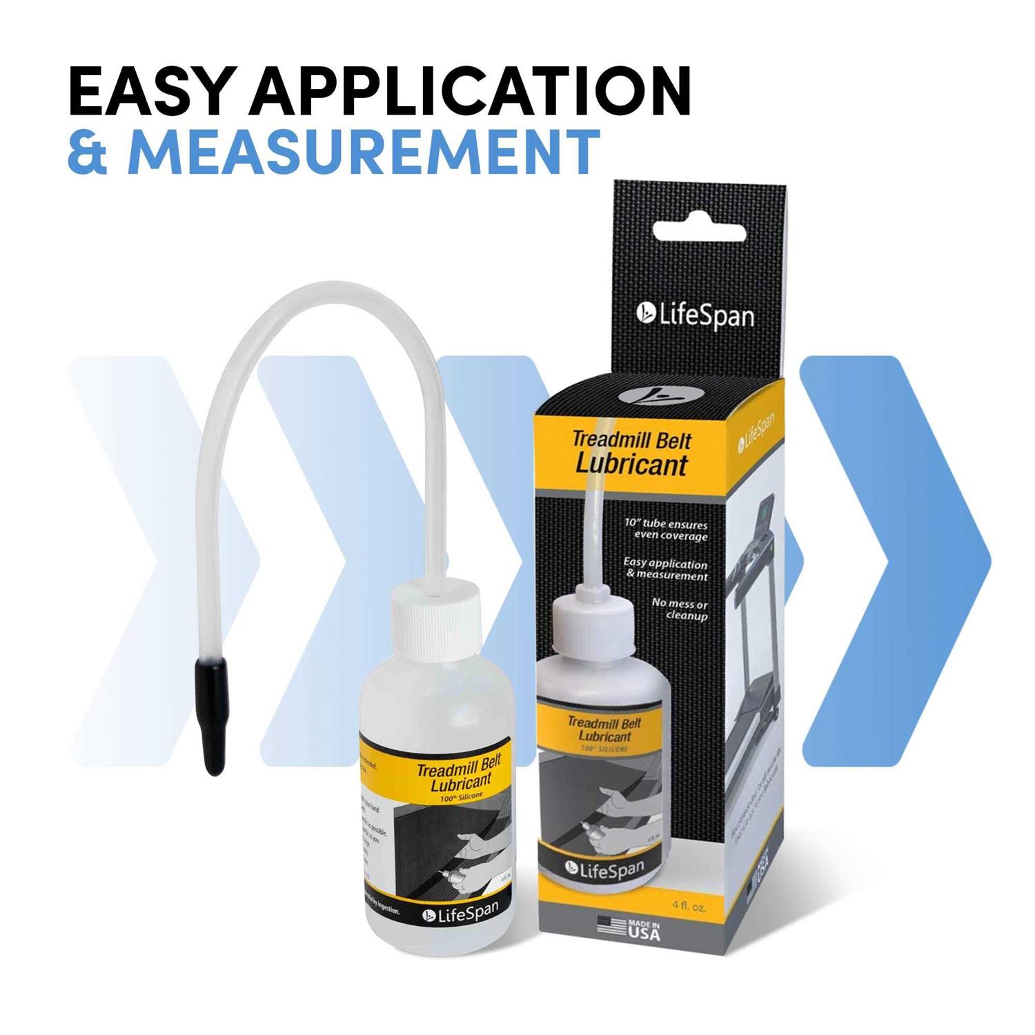 Info Keep your treadmill in optimal condition using LifeSpan’s 100% silicone treadmill lubricant. Proper lubrication on the underside of the treadmill belt is required to reduce heat and friction, prolonging the life of the motor, electronics, belt and deck. LifeSpan’s treadmill lubricant contains no harmful solvents and is colorless, odorless, non-toxic and nonflammable. Plus, the newly-updated bottle is now easier to use than ever. The new design eliminates potential spills on the treadmill belt or your flooring. This 4-ounce bottle of lubricant for treadmills is good for four applications or 3-4 months of normal treadmill maintenance. How to Lubricate Your Treadmill Belt Power off your treadmill and unplug it from the power outlet. Starting toward the front (motor end) of your treadmill, slide your hand underneath the belt and create separation between the deck and belt. Slide the lube tube as close to the center of the deck as possible. While gently applying controlled pressure to the squeeze bottle, slowly move the applicator from the center towards the edge of the treadmill belt. Apply approximately ½ oz (1/8 of bottle) to the underside of belt. Repeat steps 1-3 on the opposite side of the belt. Plug in treadmill, power it on, and use for 3-5 minutes to disperse treadmill lubricant evenly. Info Video Additional Info Keep Your Treadmill in Optimal Condition LifeSpan’s treadmill lubricant contains no harmful solvents and is colorless, odorless, non-toxic and nonflammable. Plus, the newly-updated bottle is now easier to use than ever. The new design eliminates potential spills on the treadmill belt or your flooring. This 4-ounce bottle of lubricant for treadmills is good for four applications or one year of normal treadmill maintenance.