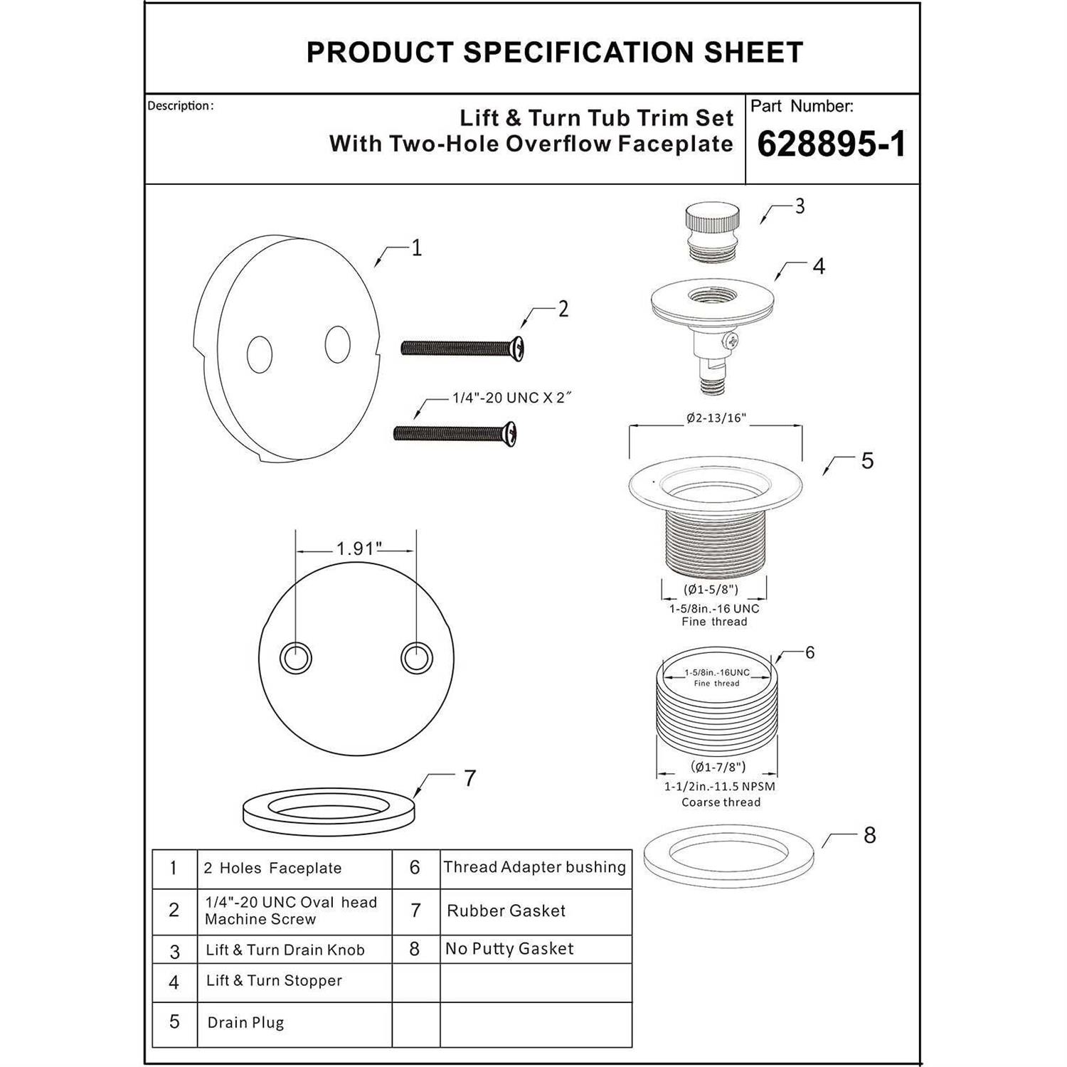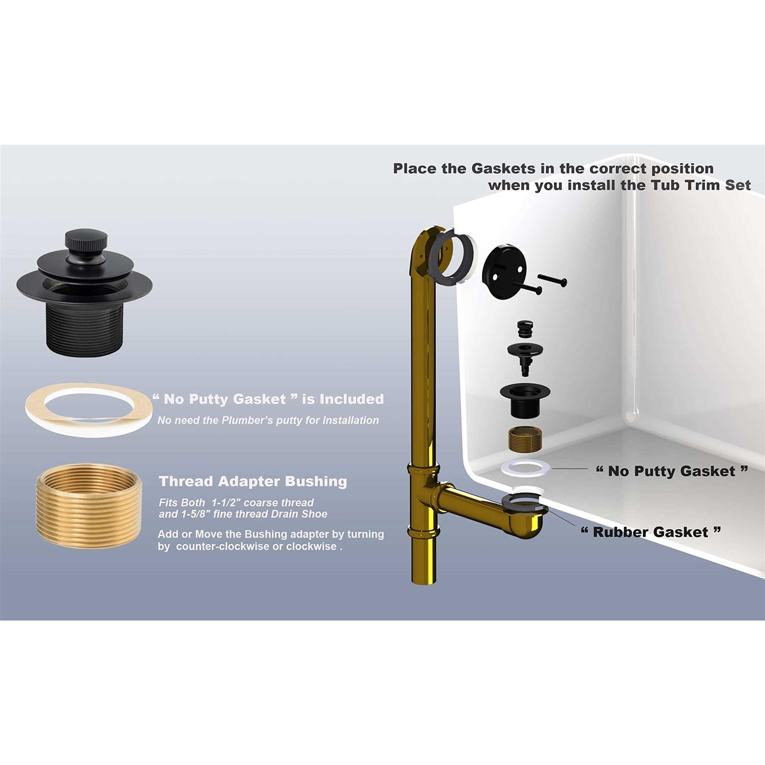 Bathtub Drains by Artiwell. Details:This designer Lift & Turn waste and overflow trim kit is the decorative solution and perfect finishing touch for your tub! Designed to fit both 1-5/8” in.-16 UNC Fine thread and 1-1/2” in.-11-1/2” NPSM coarse thread bath shoe size , with a Lift & Lock stopper Drain strainer. You’ll be able to appreciate both the beauty and performance of this item for years to come thanks to superior quality finishing and solid construction. FEATURES: – Bath tub trim set with tip Lift & Lock plug and Two-hole faceplate – Both No putty gaskets and Rubber seal gaskets inlucded . – 1-5/8” in.-16 UNC Fine thread to 1-1/2” in.-11-1/2” NPSM coarse thread adapter bushing – Solid Brass 1-5/8” in.-16 UNC Fine thread thread exterior – Two (2) 1/4 in.-20 x 1-1/2 in. overflow faceplate screws include – Drain plug washer include – Heavy duty metal construction .