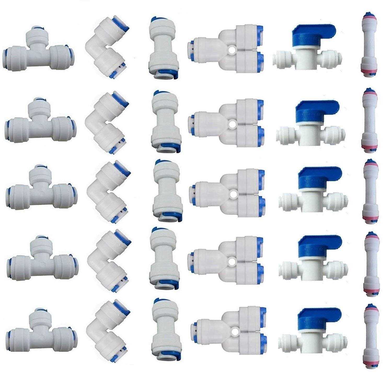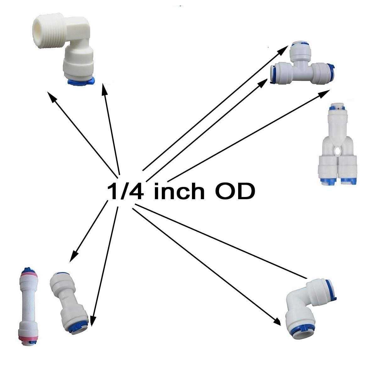 100% Safety food grade material, 100% leak free, 100% Re-useable Fits 1/4″ quarter inch OD Tubing on most RO system Standard fitting for water filter systems using 6mm water filter tubing Connect and disconnect quick and easy without any other tools;Suitable for use in hot and cold water applications Applications include RO system beverage dispensing refrigerator ice maker coffee machine etc What is it? “This replacement Combo Kit is suitable for use in hot(140°F Max) and cold (33°F Min.)water applications. It adopts Push-Fit technology, which allows users to connect and disconnect quick and easy without the need of any other tools.Operated by hand, it replace threaded or flanged connections, which require wrenches. It is used to branch off to different outlets for your RO unit.This Kit fits standard OD 1/4″ Copper, CPVC, PEX and PVC tubing for most RO systems ” Where to use it? Applications include RO system, beverage dispensing, refrigerator ice maker, coffee machine etc. How to use it? Just pop in your 1/4″ tubing into each end, pushing until it won’t go in. To remove, just push in the outer circle on each end and pull right out. You need to make sure the tubing is cut squared to insure no leaks. Be sure you cut the tubing even and straight, without crimping it. Then insert straight, and all the way into the connector. If it’s crooked, or not inserted all the way, or crimped, it may leak What you will receive? 5 x 1/4″ OD Inline Shutoff Ball Valve 5x 1/4″ OD Union Connector 5x 1/4″ OD Union Elbow 5x 1/4″ Union Tee 5x 1/4″ Two Way Divider 5 x 1/4″ OD check Valve “C” clips