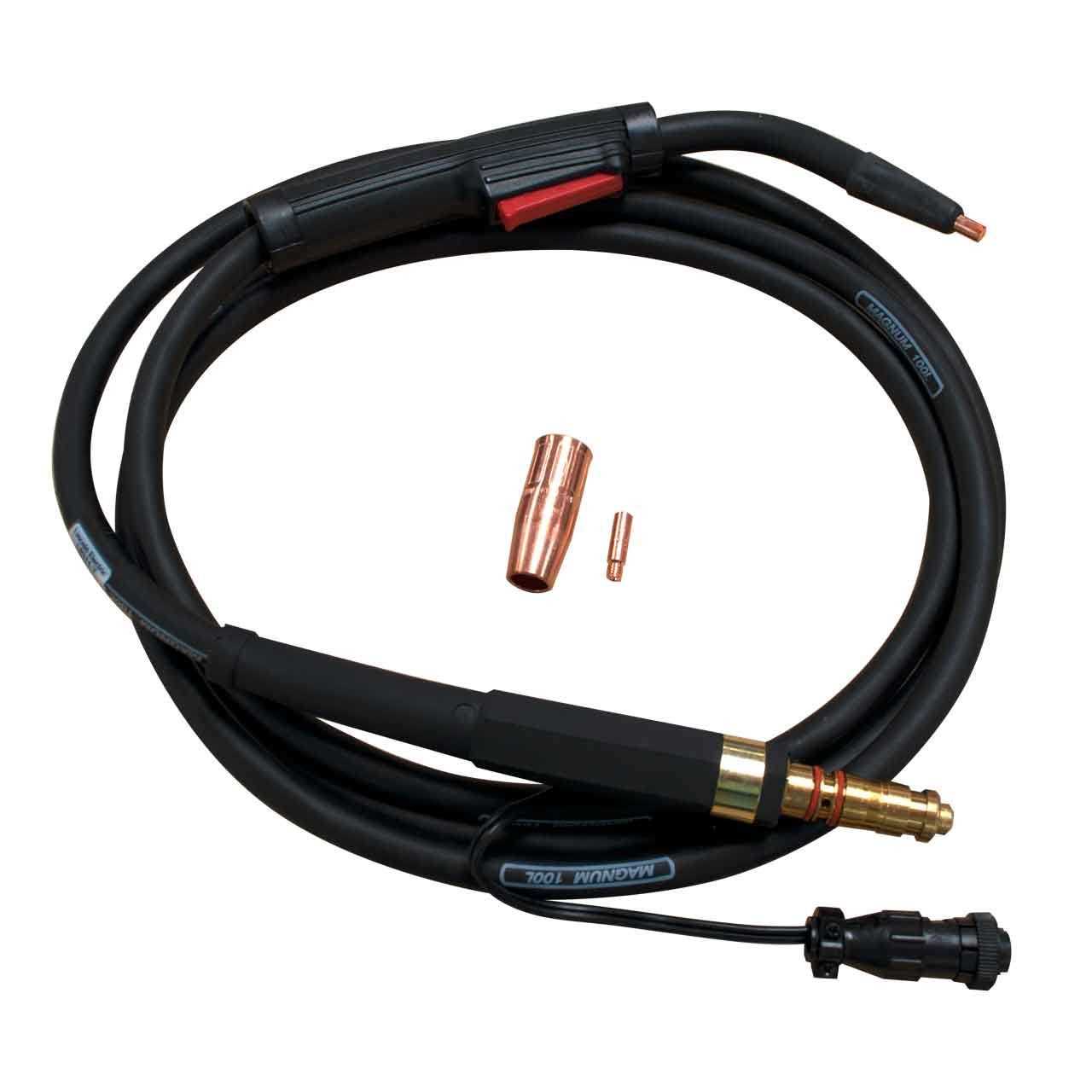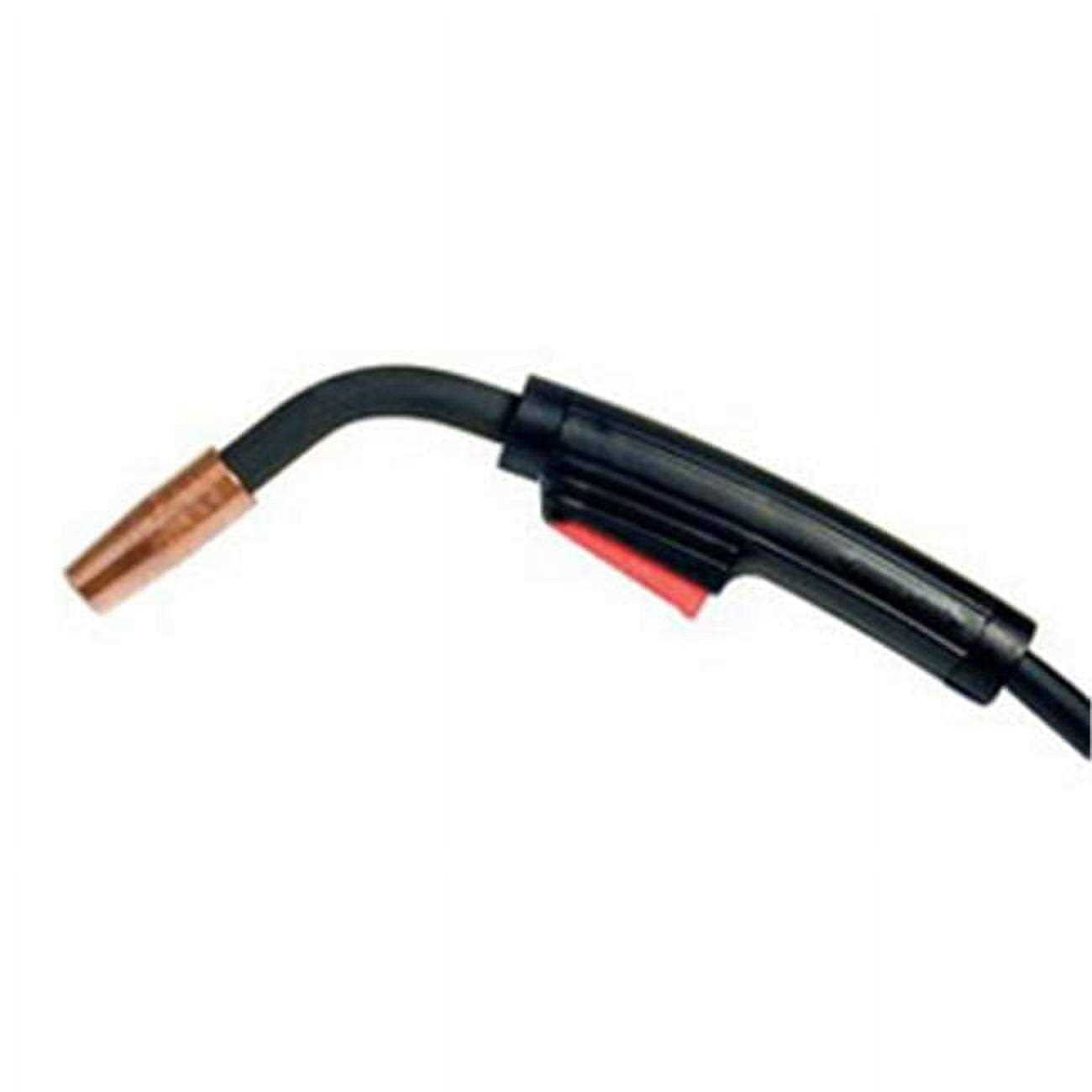 Air-cooled gun is suitable for applications requiring current rating of 100 A and is designed to be used with flux-cored gas-shielded continuous feed arc welding wires. It optimizes fine wire welding performance and features one-piece modular trigger assembly that withstand heat and spatter. It reflects radiant heat from the weld with buffed gun tube and offers resistant to abrasion. Gun tube features an extruded rubber jacket that adds strength to the cable and eliminates wear problems. It has internal extruded tube that offers excellent gas sealing integrity and expendable parts are compatible with other leading brands. It features a comfortable handle design that provides balance, reduces operator fatigue and offers a sure, confident grip. It includes one-piece replaceable trigger assembly that has high quality silver contacts for long life and clean electrical signals. Rugged strain relief system increases feedability by reducing acute gun cable angles and protects your cable liner. Rotatable gooseneck is useful to complete high quality welds even in tight spaces or awkward joint locations.