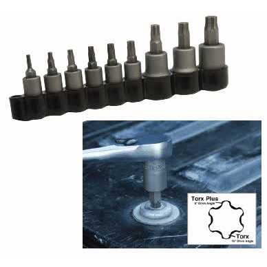 Torx Plus drivers will not fit standard Torx fasteners. Standard Torx drivers will fit Torx Plus fasteners, but not to full torque because of the loose fit, and are not recommended. Some common Torx Plus applications include GM transmission bell housing bolts, Ford seat belt anchors and Ford pick-up bed bolts. Six smaller bits are 1/4″ drive and three larger bits are 3/8″ drive. Vinyl holder for storage included. Sizes include: Tp-10, Tp-15, Tp-20, Tp-25, Tp-27, Tp-30, Tp-40, Tp-45 and Tp-50.