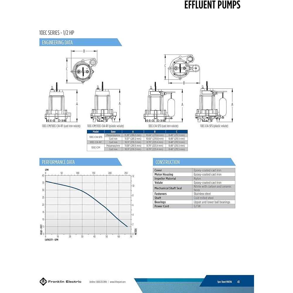 Heavy-duty cast iron construction. Permanent split capacitor (PSC) motor with thermal overload protection. Designed for continuous duty. Energy-saving low amp draw. Cooler running motor. 1-1/2-inch FNPT (38 mm) discharge. Handles solids up to 1/2-inch (12.7 mm) diameter. 140 °F (60 °C) liquid temperature rating.