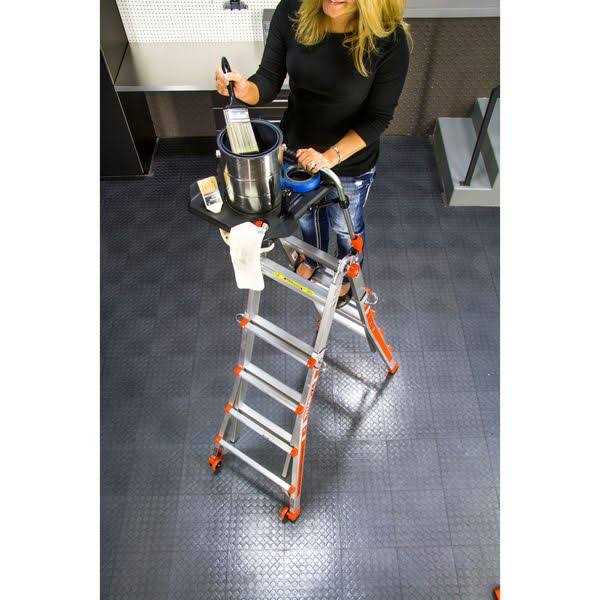 Using the AirDeck as a handrail, maintains your three points of contact on the ladder. The AirDeck has grooves, slots and fitted recesses to hold tools and paint containers. Save time by keeping your materials with you at the top of the ladder. Holds up to 25 lbs. The AirDeck easily connects to several Little Giant products, including the Select Step. The AirDeck features a multi-use tray for tools and materials and a safety handrail for extra stability. With the AirDeck, you can use the full recommended height of your ladder in comfort and safety. The Air Deck’s utility tray includes slots for power tools, screwdrivers and other tools; and fitted recesses for all sizes of paint containers (square gallon, round gallon and round quart). The AirDeck’s work tray is rated to hold up to 15 pounds of tools and materials. Note: Compatible only with Xtreme/Model 17, Xtreme/Model 22, Xtreme/Model 26, Type 1A Select Step/Model 5-8 and Type 1A Select Step/Model 6-10.