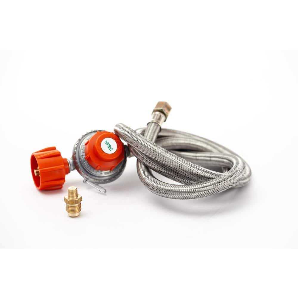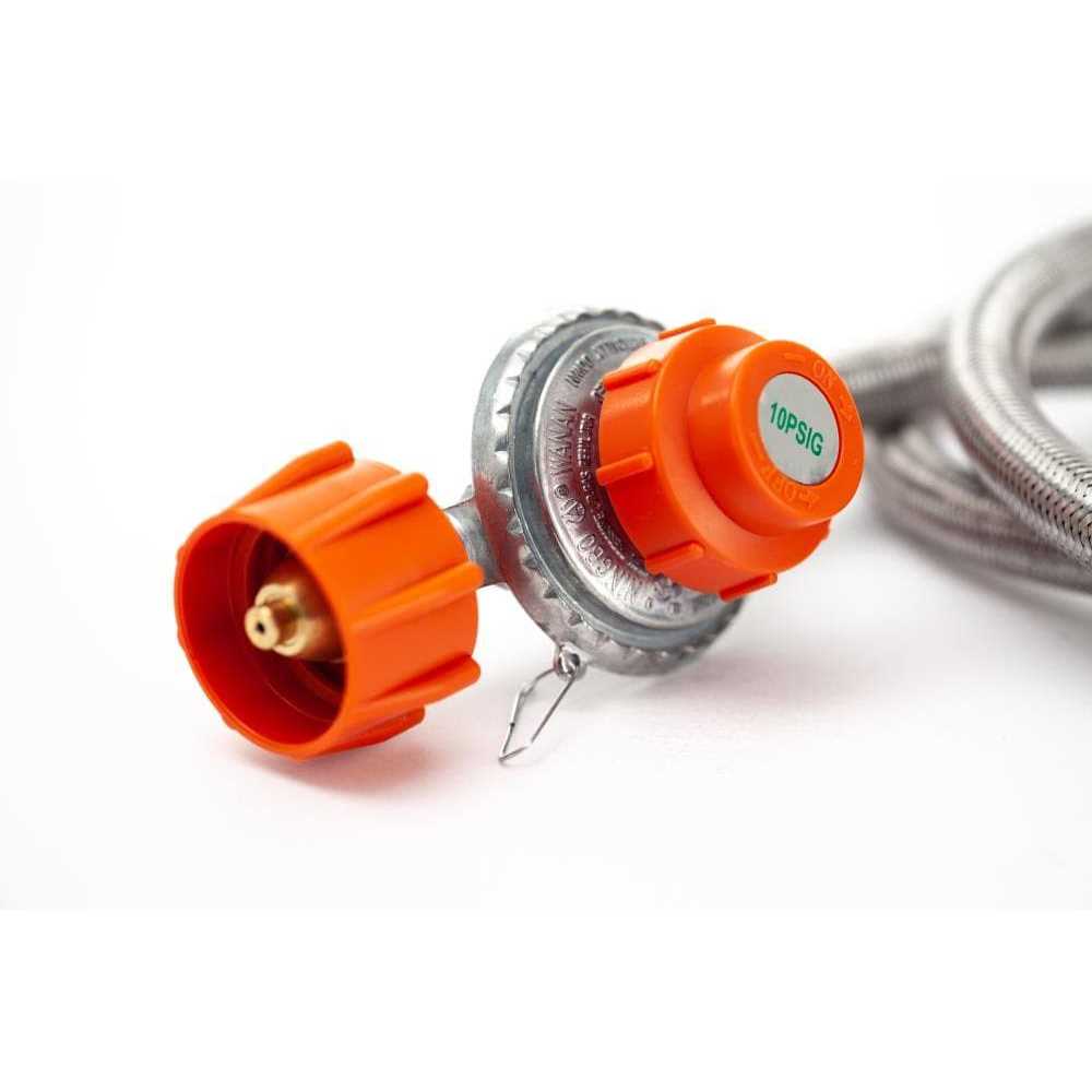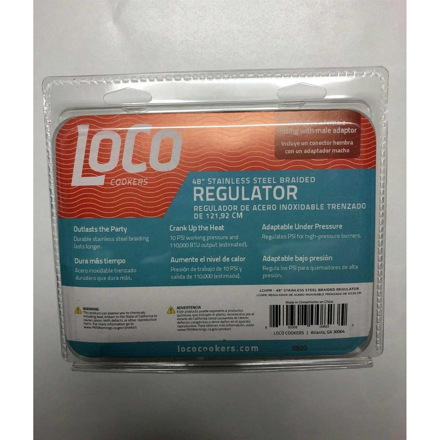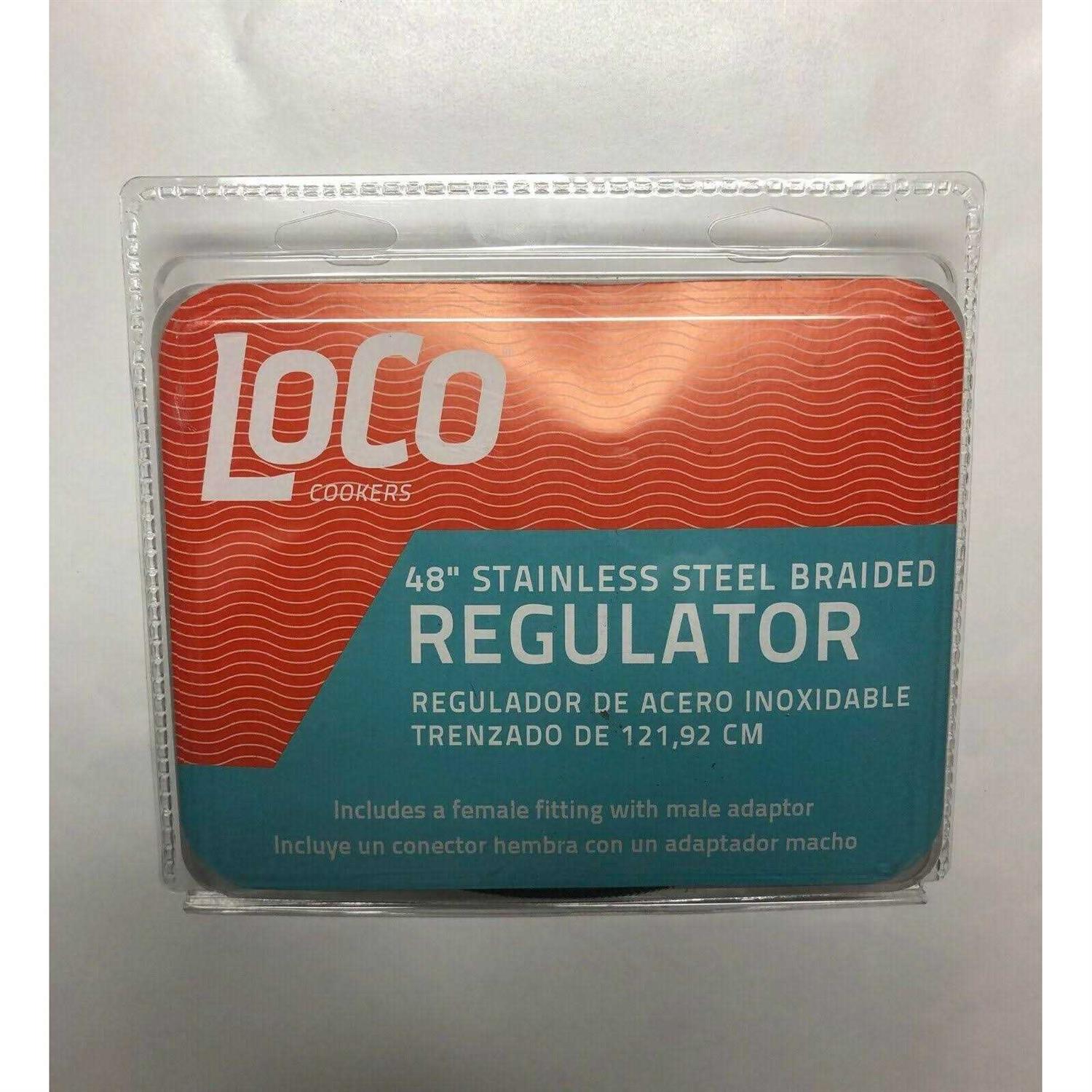 The LoCo cookers 48-in high pressure regulator with hose has a flow regulator safety valve and CSA certified. The 48-in stainless braided hose increases the distance from the propane tank to your cooking stand and pot. Our regulator hose comes with both male and female connectors with a universal connection.