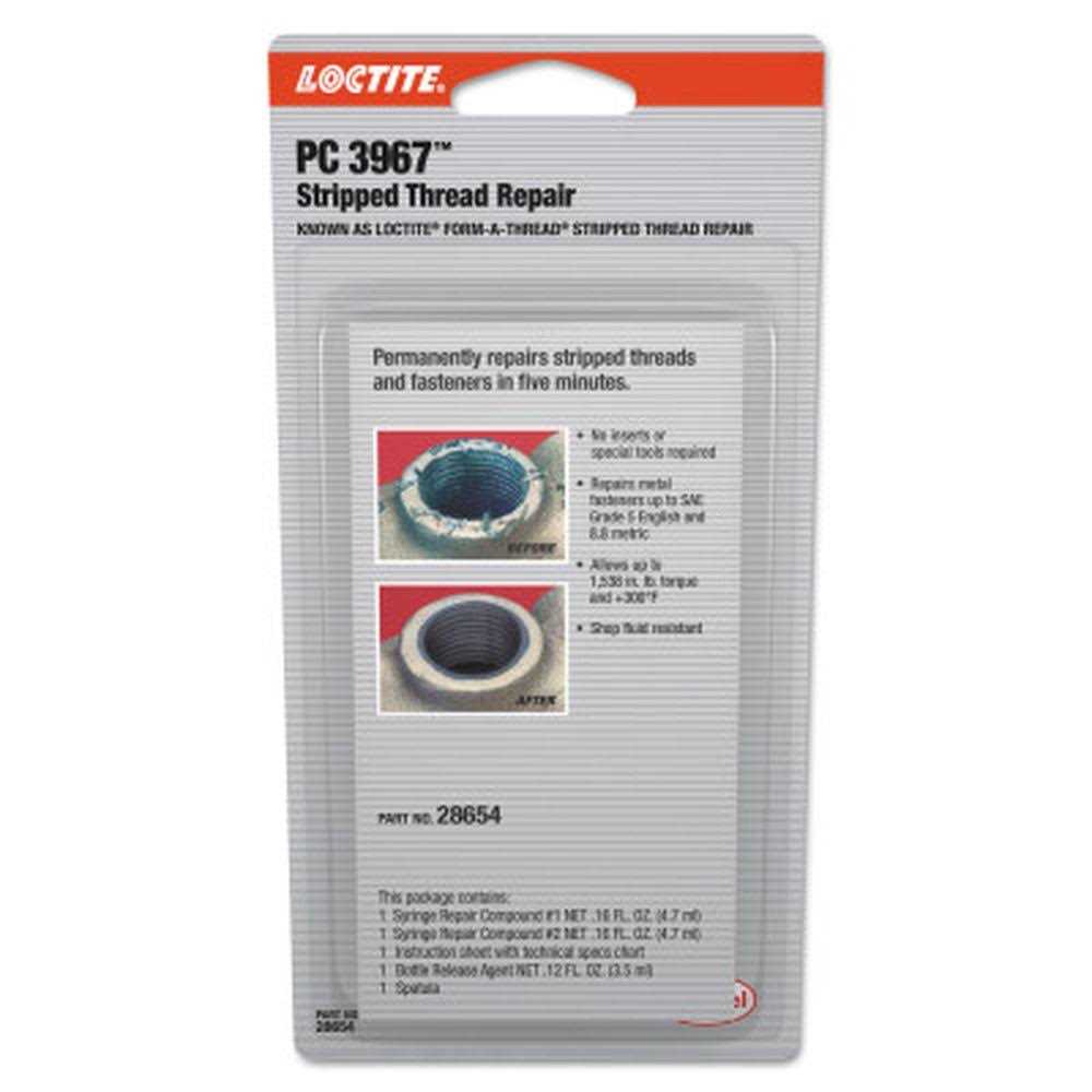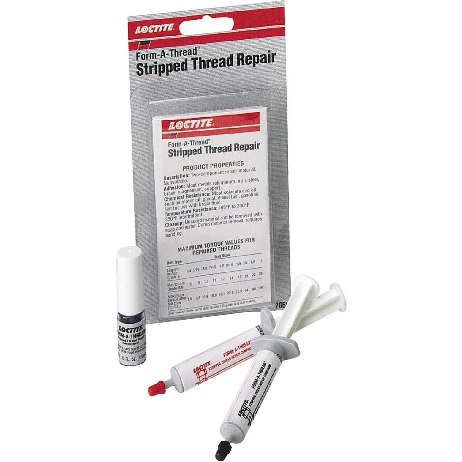 Loctite Form-A-Thread Stripped Thread Repair, makes reliable thread repairs without drills, taps, tools, or inserts. Restores worn, stripped or damaged threads and eliminates future corrosion, galling, seizing, and rust. Allows up to 128 ft. lbs. of torque between -65°F to 300°F. Permanently repairs stripped threads and fasteners in five minutes (up to SAE Grade 5 English and 8.8 metric).