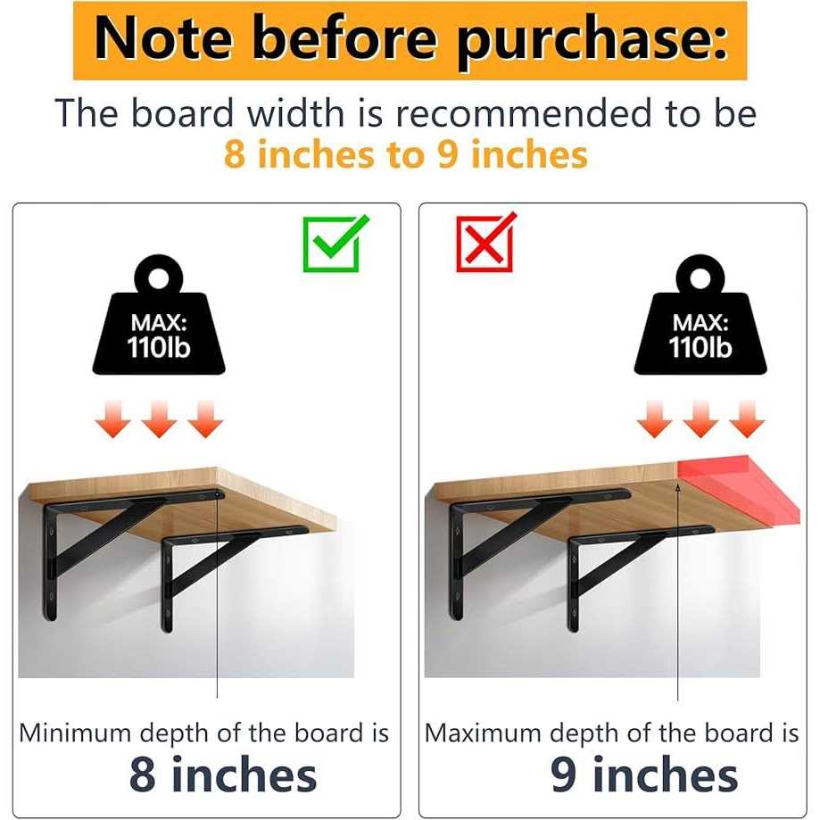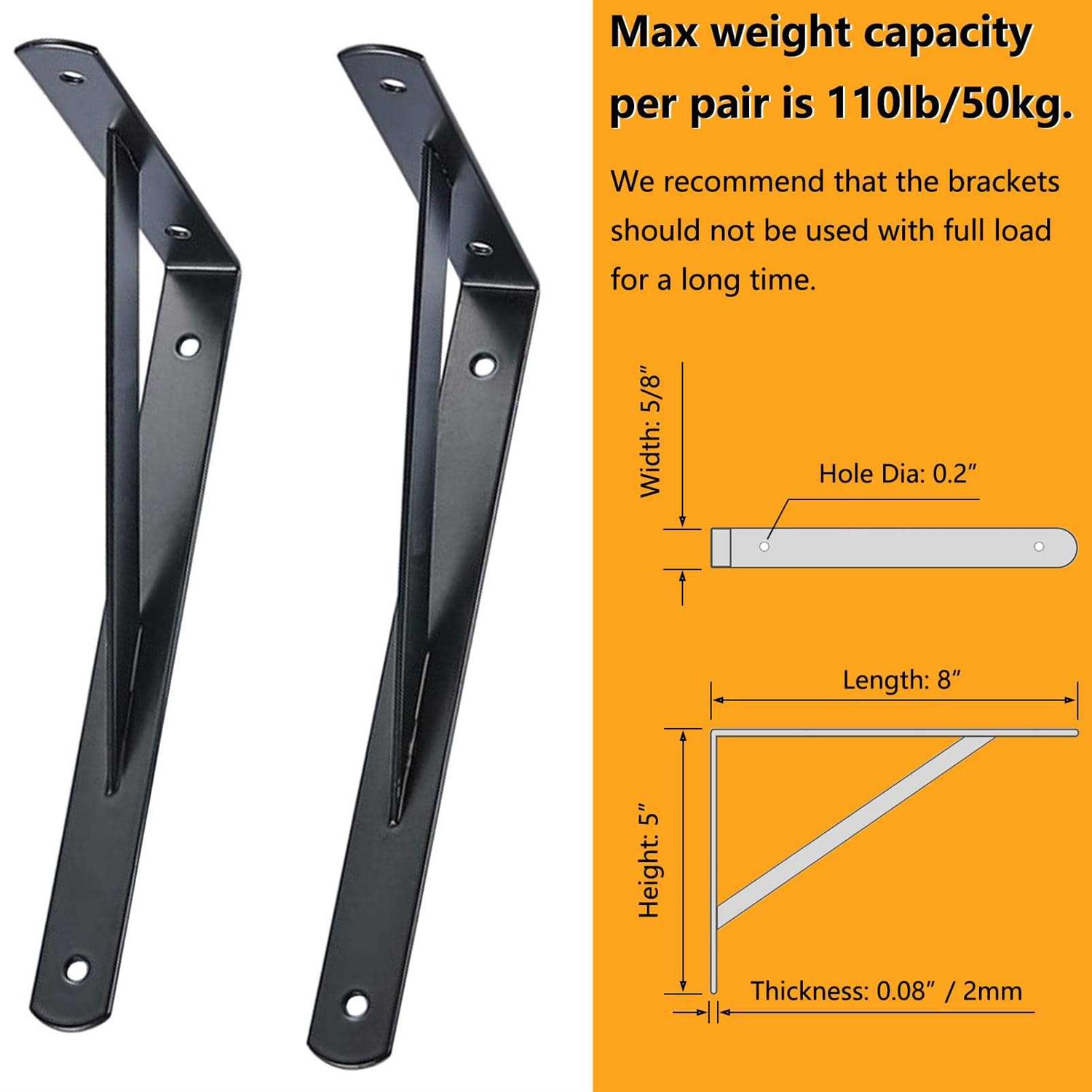 Brackets by LOUFOGEI. Details:LOUFOGEI Heavy Duty Shelf Brackets Specification: Packaged: 4* steel brackets, 8*Mounting Screws, 8*Shelf Securing Screws, 8*Wall Anchors Bracket Size: 8” x 5” Thickness: 2 mm/0.08 inch Hole Dia: 8 mm/0.31 inch Material: High Quality Steel Coating: black powder-coated finish Color: Black Type: L shelf bracket Installation Method: Screw fixing (Screws are included) Loading Capacity: 110lb/50kg each pair These heavy duty metal shelf brackets ( 8 inch X 5 inch ) are widely used in DIY home improvements. You can quickly create floating shelves in the kitchen, living room, bathroom, office and garage.