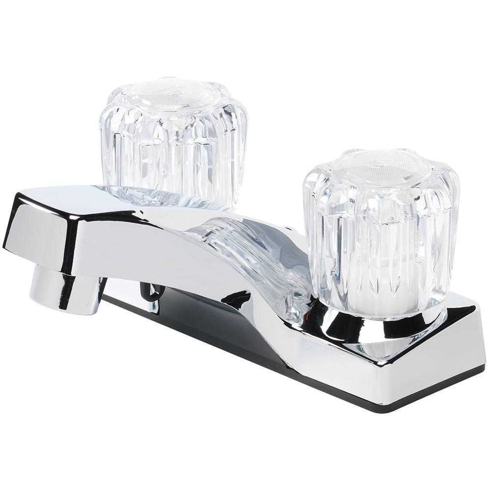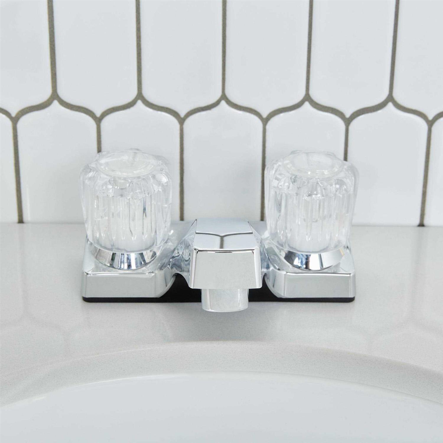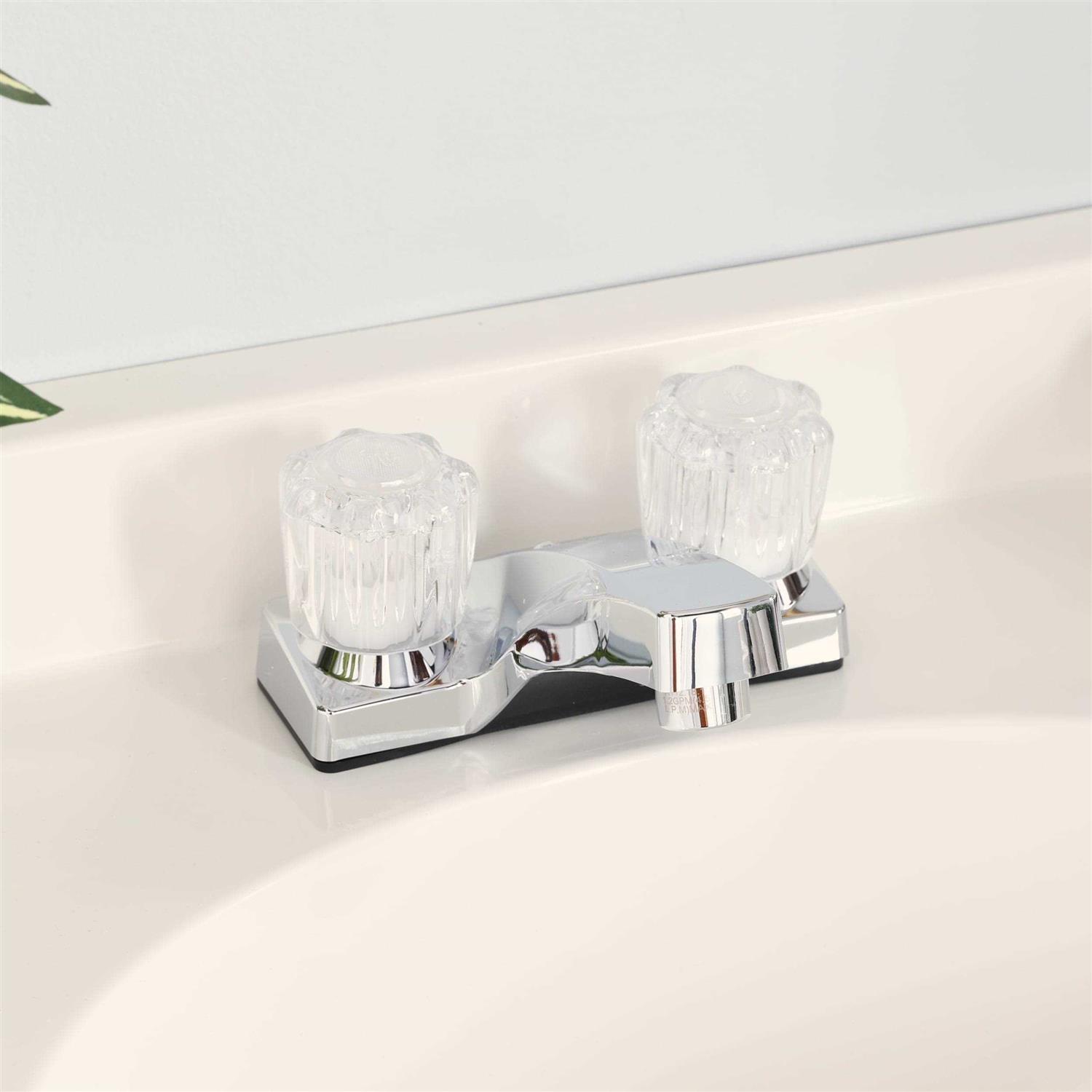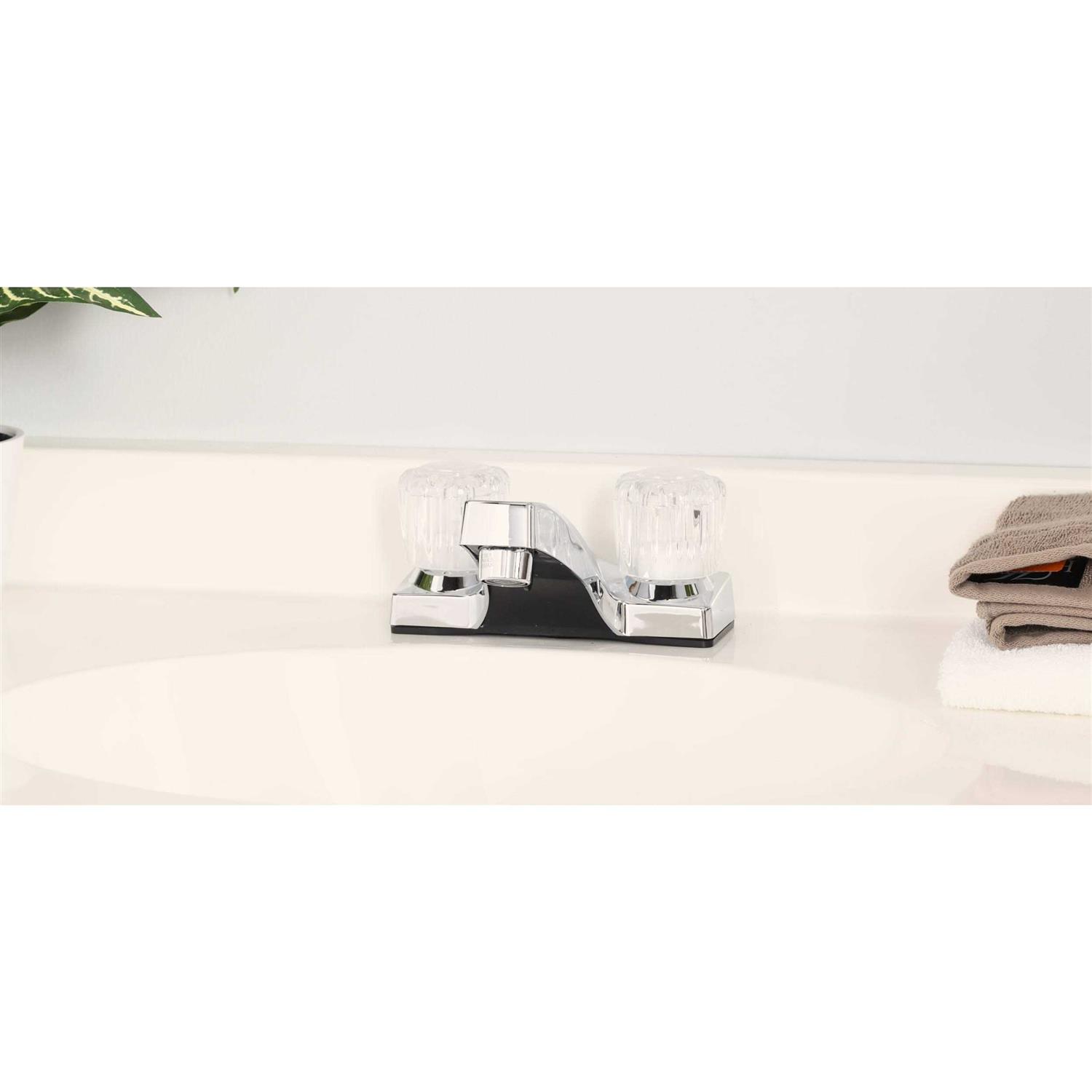 This bath faucet with acrylic handles from Homewerks is a favorite of builders and contractors for value bathrooms. Its chrome finish will match well with most bathroom styles and decor. The 4-inch centerset will install on most 3-hole bathroom sinks. Two acrylic handles provide you easy control over the waterflow. This two handle bathroom faucet is designed to conserve water without sacrificing performance with its WaterSense certification. A pop-up drain assembly not included. This two handle faucet with acrylic knobs from Homewerks is a great value for the bathroom. Chrome finish. 2 Handle quarter turn operation. Washerless valves help prevent leaks. 4 in. center set installation fits most standard 2 hole sinks. Acrylic handles with hot and cold indicator buttons.