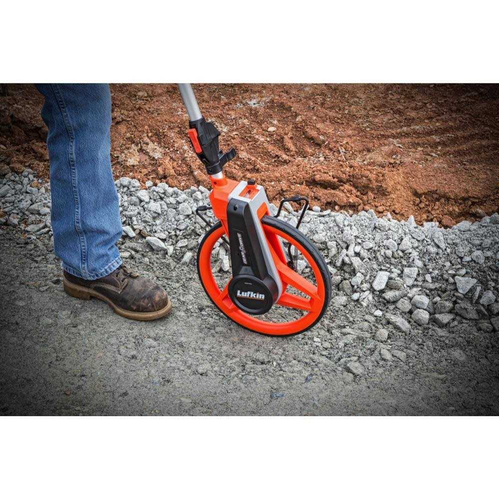 Suitable for measuring vertical, horizontal or curved surfaces, The large Crescent Lufkin professional centerline SAE measuring wheel displays surface dimensions in feet and inches for Quick, accurate distance calculations. It features a 12-inch wheel with a rubber tire for superb traction on the uneven terrain of job sites or long indoor expanses. The analog Counter dial calibrated to the wheel counts to 10, 000 ft. Before rolling over to 0.