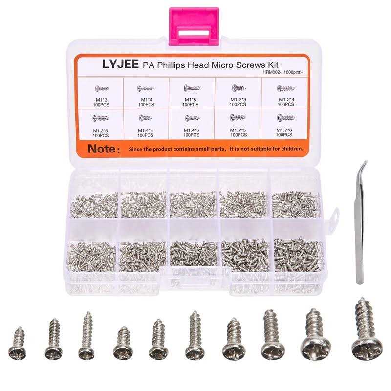 The screws is very small screws:A large assortment 10 of the most-used sizes is provided to suit your needs, Ideal for home, office, work, garage, business & industrial applications These mini screw kit / self-tapping screws, are highly versatile and are used to attached metal, wood, fiberglass, and plastic Self-tapping Screw is made of Stainless Steel, the threads create their own mating thread in pre-drilled holes Self-tapping metal screws are fully threaded with a sharp point. This Screws Nuts Set is well packed and assorted in a plastic box, worry free about damage or disorder. The box design is nice and easy to take right screw out. Descriptions:The screws are very small screws, pls check the size first. The mini screw kit does not need to be used with the nut. The tooth thread is self-tapping, and the triangular tooth self-extrusion screw at the end point is formed. When it is screwed into the hole of plastic metal,the wood or thin iron material, the internal thread is formed. Extrusion and the reliable locking thread connection is formed in the hole . Material: Carbon Steel Unit:mm Size:Diameter*length Package include: Phillips Micro Mini Screws M1*3 100PCS Phillips Micro Mini Screws M1*4 100PCS Phillips Micro Mini Screws M1*5 100PCS Phillips Micro Mini Screws M1.2*3 100PCS Phillips Micro Mini Screws M1.2*4 100PCS Phillips Micro Mini Screws M1.2*5 100PCS Phillips Micro Mini Screws M1.4*4 100PCS Phillips Micro Mini Screws M1.4*5 100PCS Phillips Micro Mini Screws M1.7*5 100PCS Phillips Micro Mini Screws M1.7*6 100PCS