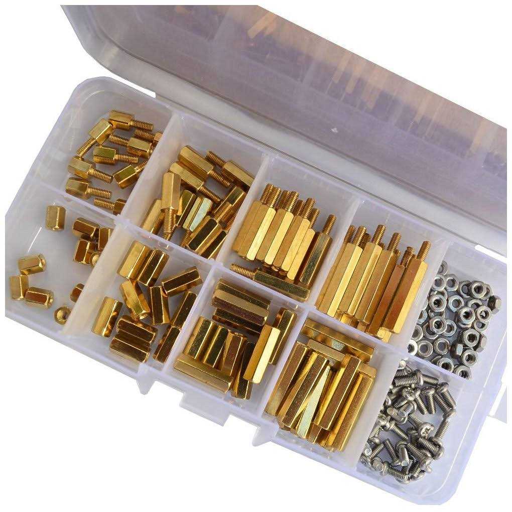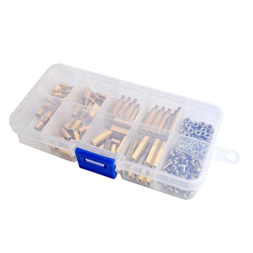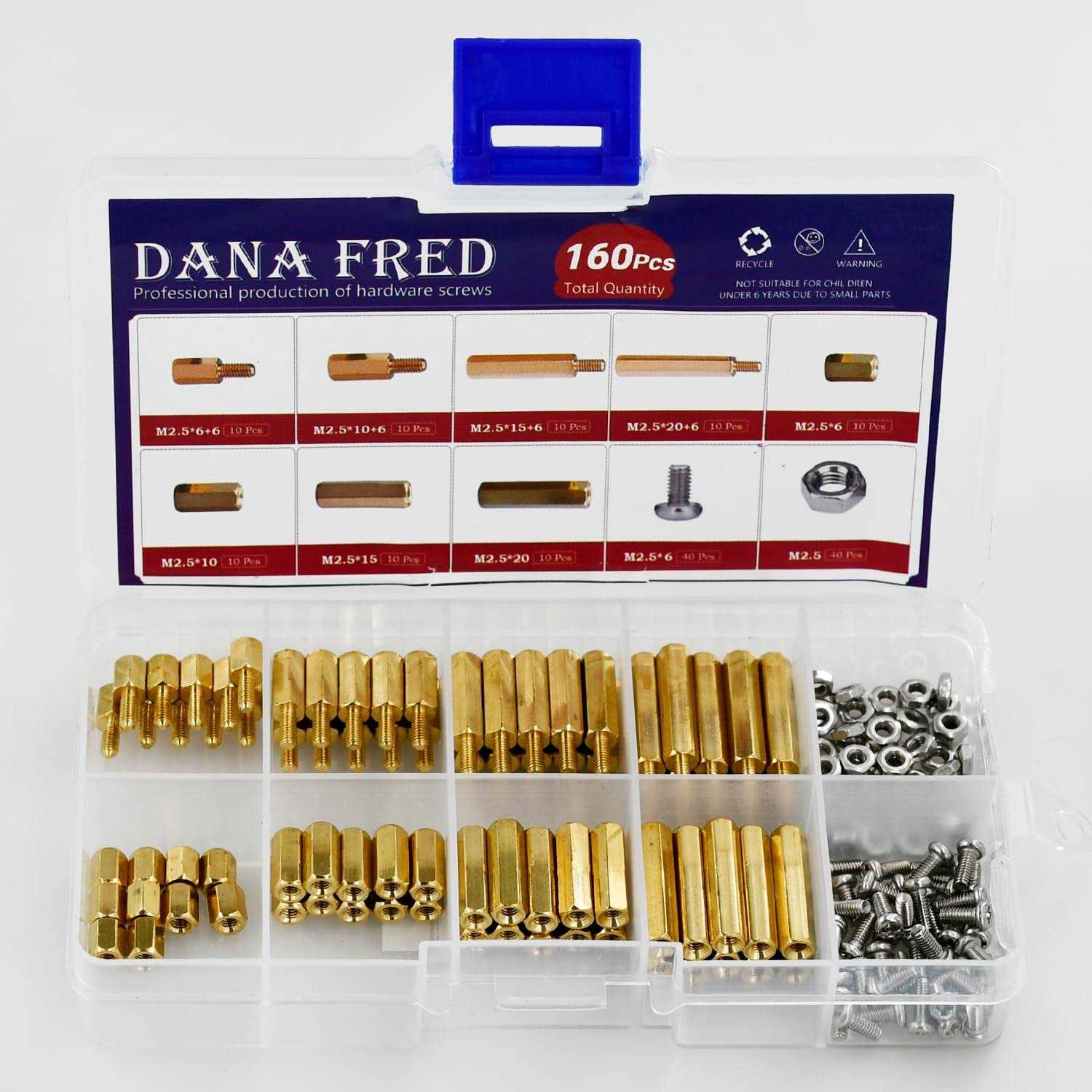 Package include: brass Hex Screw Nut Assortment Kit M2.5 total 160 pieces. Come with the plastic box: List(Type,Length / Thread,Quantity) Brass Male-Female Standoff 6mm+6mm, M2.5 10pcs Brass Male-Female Standoff 10mm+6mm, M2.5 10pcs Brass Male-Female Standoff 15mm+6mm, M2.5 10pcs Brass Male-Female Standoff 20mm+6mm, M2.5 10pcs Brass Female to Female 6mm M2.5 10pcs Brass Female to Female 10mm M2.5 10pcs Brass Female to Female 15mm M2.5 10pcs Brass Female to Female 20mm M2.5 10pcs 304Stainless Steel Screws M2.5 x 6mm 40pcs 304Stainless Steel Nuts M2.5 40pcs Packing contents: 160pcs M2.5 Brass Standoff / Stainless Steel Screw / Nut Assortment Kit.