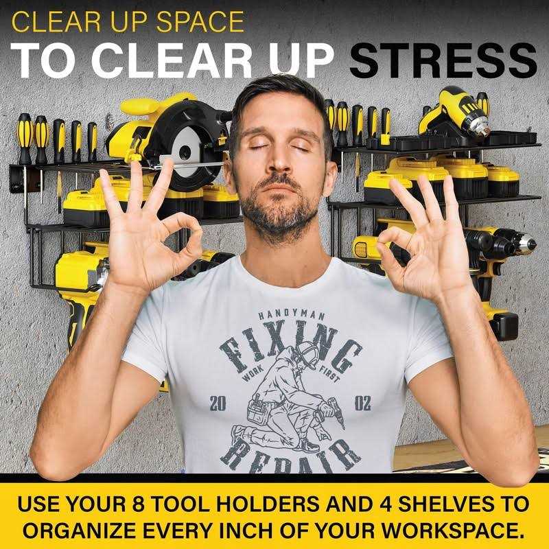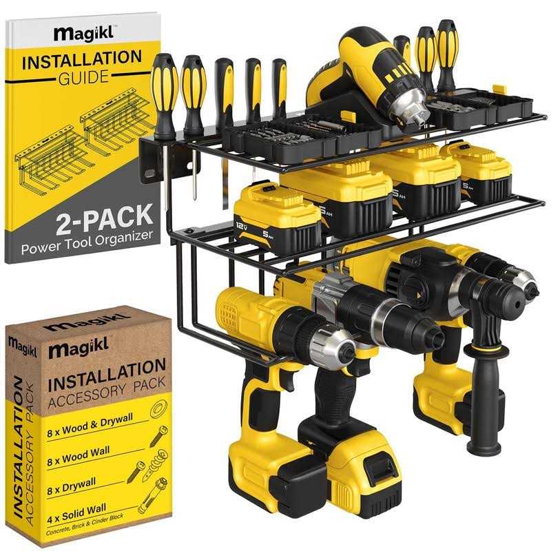 Rack and Roll! – Tidy up and save space with your corded and cordless power tool organizer for garage walls. Store 110 lbs. of toolware between your 2 mounts’ 8 tool holders and 4 mini-shelves. Hang in There – Keep your tools secure and solidly in place while protecting them from drops or slips with your cordless tool organizer’s sturdy storage shelves and curved, upward-angled drill hangers. From Chaos to Calm – Help your favorite handyman or DIY woman organize every inch of their workspace. Your power-tool storage organizer will help make their messiest sheds quite a bit cleaner. Tool Around Better – Take home improvement and handy hobbies up a notch with your tool rack organizer from Magikl. Weight off Your Shoulders br br Clear up, clean up, and spruce up your workspace using your 2 power-tool storage racks. Hang up to 8 standard-shaped drills on their own 1.65 in. hanging spaces. Store any of your workshop essentials on your reinforced steel shelves. Hold up to 55 lbs. per rack—or 110 lbs. altogether—of your workshop essentials so you can save on space for your most important projects with your corded or cordless tool storage racks. br br Easy Air Rack Setup br br Mount your air tool-storage rack with the included illustrated, easy-to-follow instructions. Drill your rack into any wall, including drywall, concrete, and wood, that has standard 2 x 4 in. studs. Mount it straight onto walls with standard 16 in. stud spacing, or use a backer board or pegboard for nonstandard stud placement. Have your mount up in just minutes so you can dedicate more time to more projects. br br Safe Storage, Sweet Setup br br Secure your most valuable garage gems in your tool-storage wall mount.