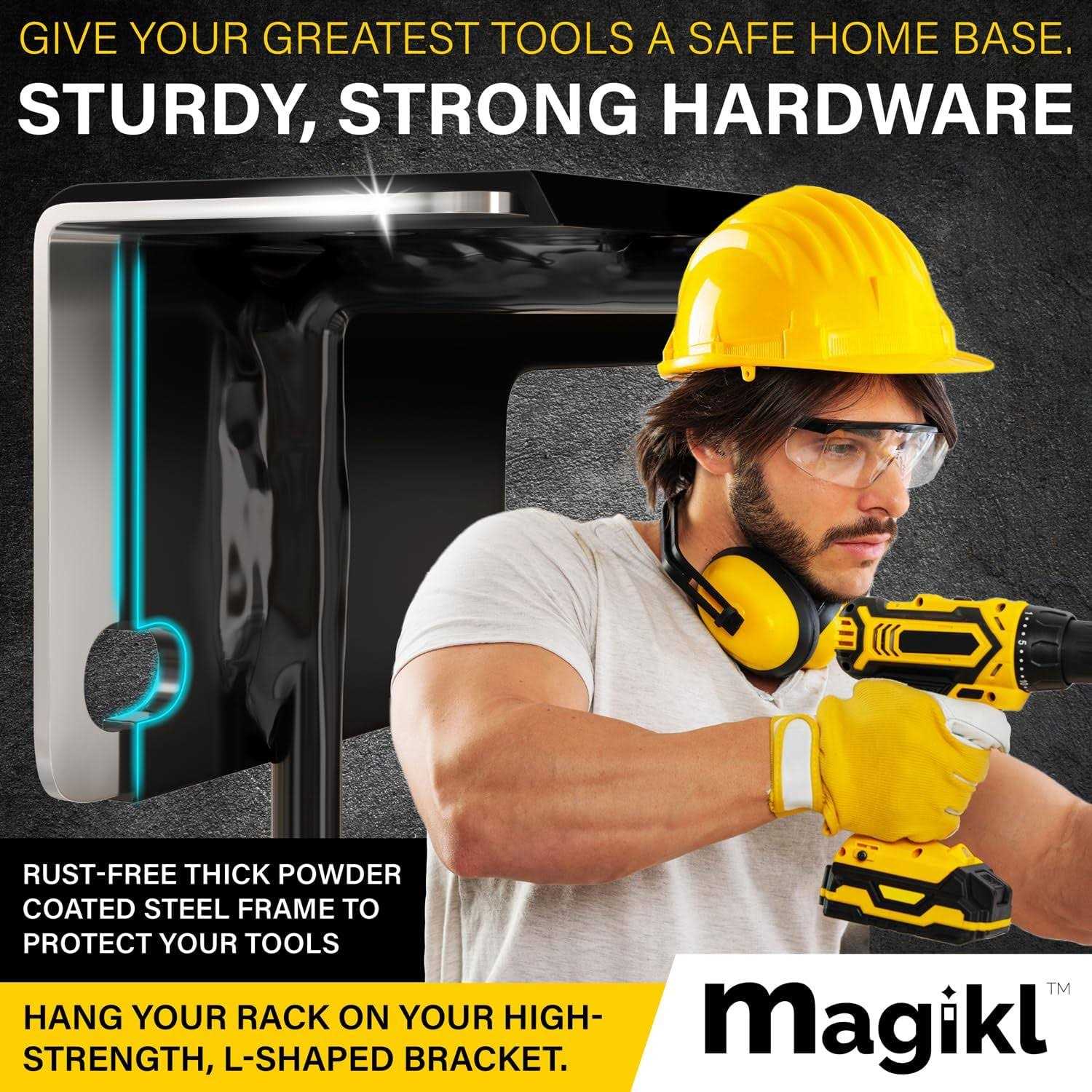 Magikl Steel Power-Tool Organizers and Storage – Store 110 lbs. of Tools Between 2 Reinforced Steel Tool-Organizer Racks – 2 Shelves & 4 Hangers per