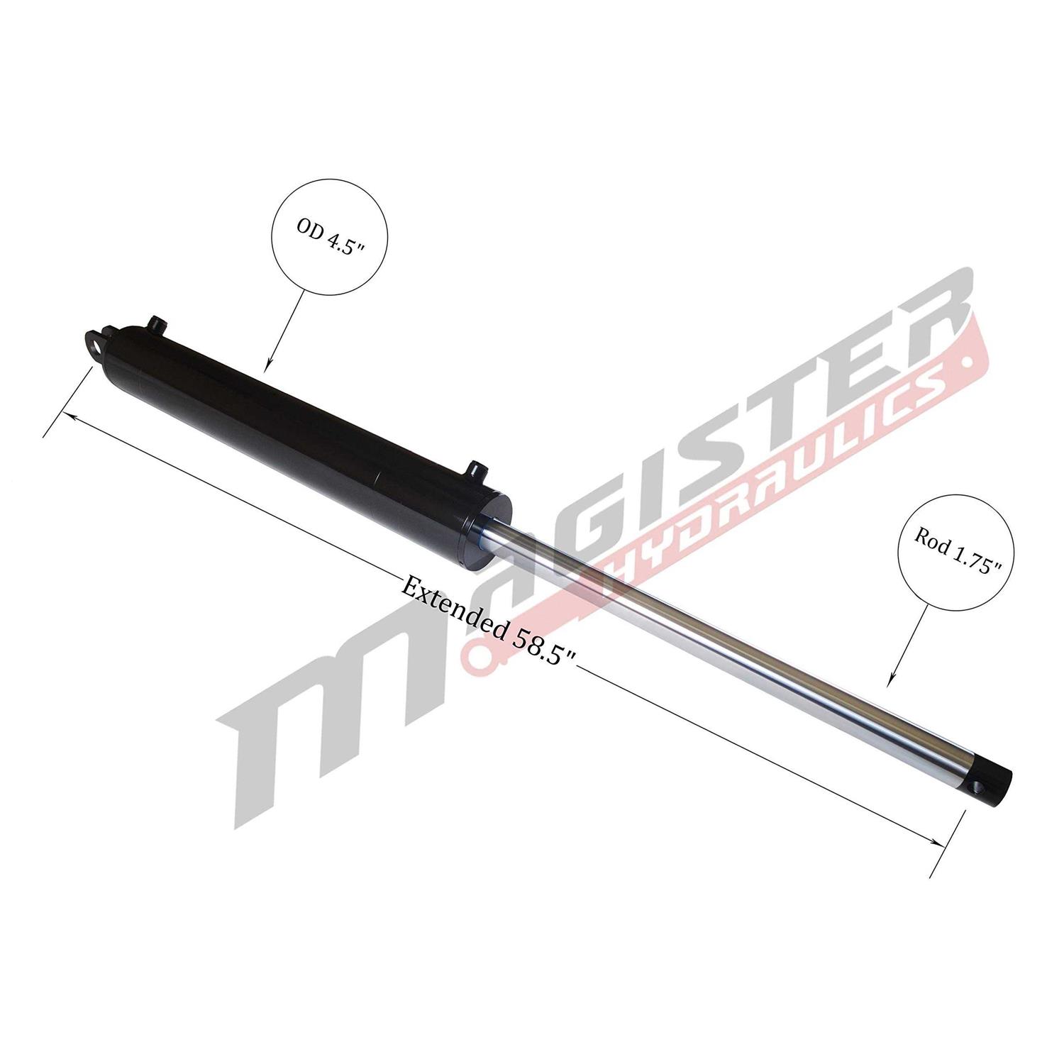 - Bore 4″ (OD 4.5″), Stroke 24 inch, Rod 1.75″, Retracted 34.5″, Extended 58.5″, Pins 1-1/8″, 9/16″