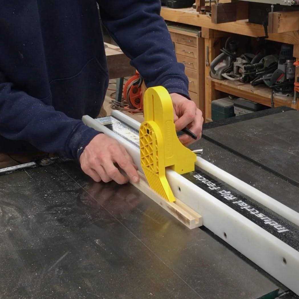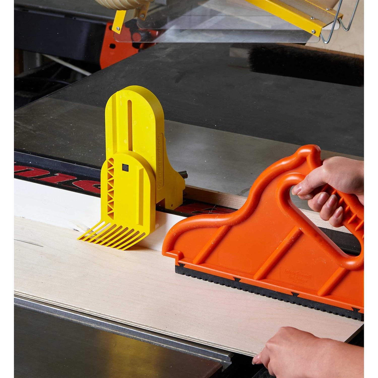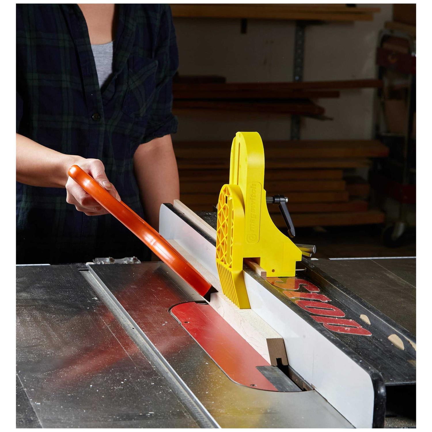 To improve safety and accuracy on a table saw, especially when working with thin materials, this featherboard keeps stock pressed firmly against the tabletop to reduce the risk of kickback and to help prevent it from lifting during the cut. It uses a switchable magnetic clamp to mount on steel-topped Biesemeyer-style fences with an upper channel 1 7/8″ to 2 5/8″ wide; for wider channels, such as on the SawStop T-Glide fence, shimming is required. In the “on” position, the magnets align, exerting a strong hold with a breakaway strength of 150 lb. When the locking latch is disengaged, the magnets counteract each other, instantly releasing for easy removal or repositioning. Molded from durable ABS, the 3 1/8″ long by 9/16″ wide featherboard is height-adjustable in a 4 5/16″ range to accommodate various stock thicknesses. It can be reversed for use on either side of the blade, and two or more featherboards can be linked to span long workpieces.
